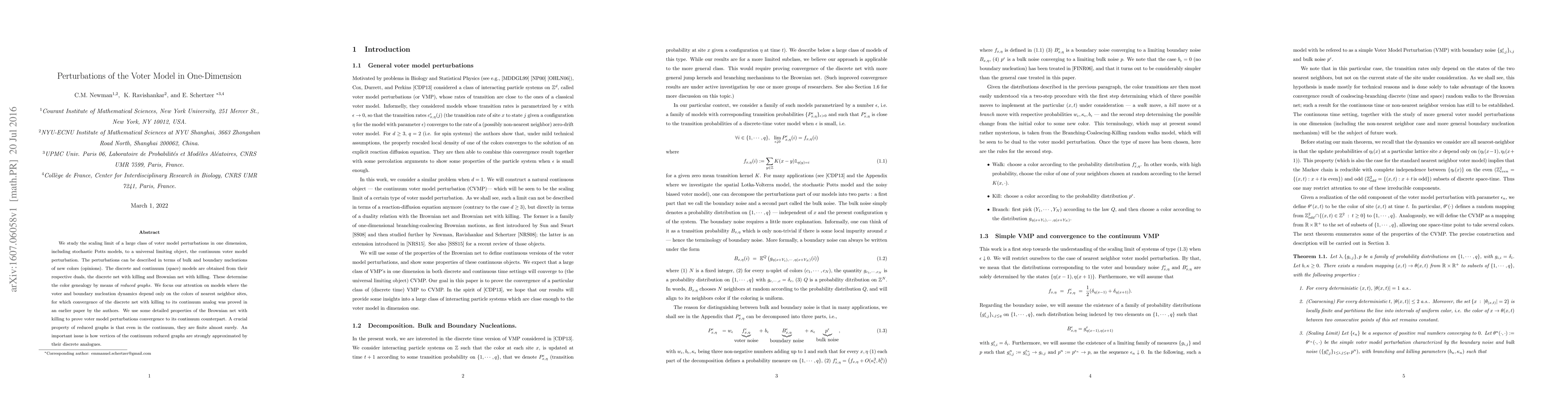 This paper investigates the scaling limit of various perturbations of the voter model in one dimension, converging to a continuum voter model perturbation. It focuses on models where dynamics depend on nearest neighbor colors, proving convergence using properties of the Brownian net with killing and finiteness of reduced graphs.