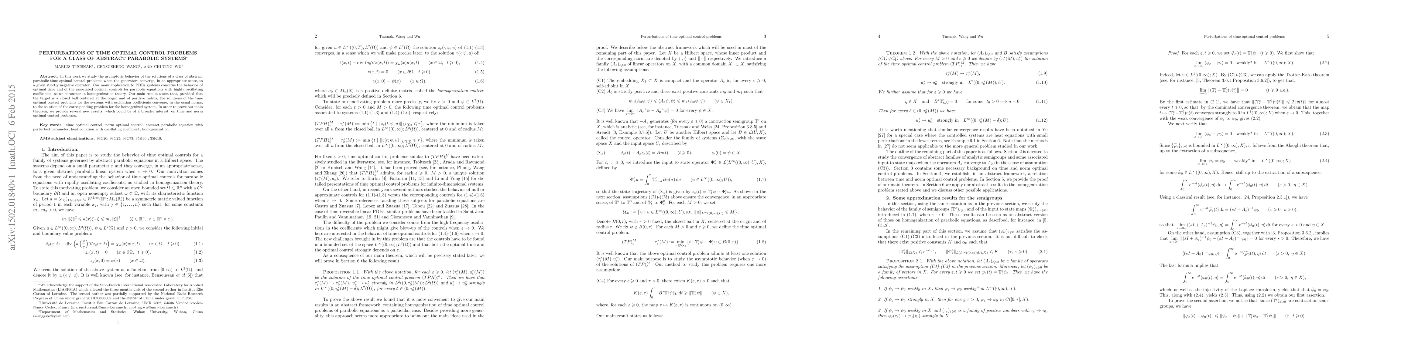 In this work we study the asymptotic behavior of the solutions of a class of abstract parabolic time optimal control problems when the generators converge, in an appropriate sense, to a given strictly negative operator. Our main application to PDEs systems concerns the behavior of optimal time and of the associated optimal controls for parabolic equations with highly oscillating coefficients, as we encounter in homogenization theory. Our main results assert that, provided that the target is a closed ball centered at the origin and of positive radius, the solutions of the time optimal control problems for the systems with oscillating coefficients converge, in the usual norms, to the solution of the corresponding problem for the homogenized system. In order to prove our main theorem, we provide several new results, which could be of a broader interest, on time and norm optimal control problems.