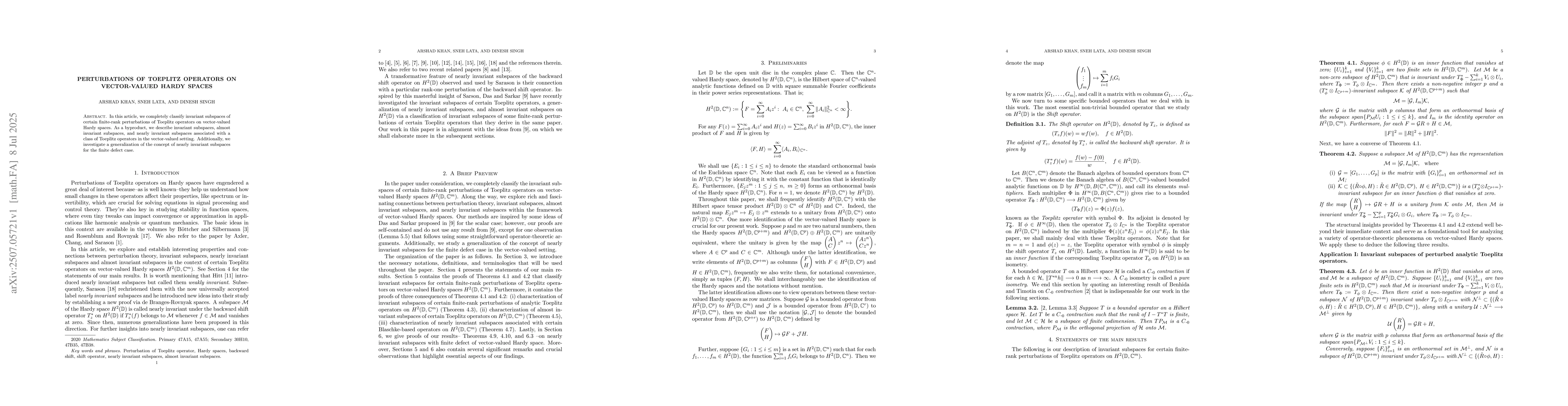 In this article, we completely classify invariant subspaces of certain finite-rank perturbations of Toeplitz operators on vector-valued Hardy spaces. As a byproduct, we describe invariant subspaces, almost invariant subspaces, and nearly invariant subspaces associated with a class of Toeplitz operators in the vector-valued setting. Additionally, we investigate a generalization of the concept of nearly invariant subspaces for the finite defect case.