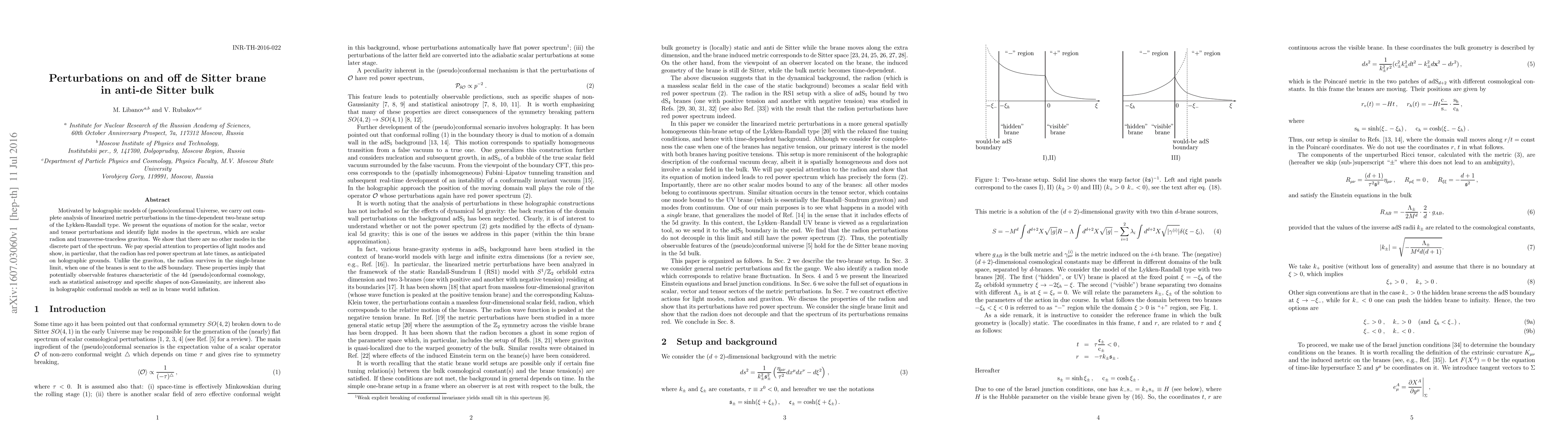 This paper analyzes linearized metric perturbations in a two-brane setup within an anti-de Sitter bulk, identifying scalar, vector, and tensor perturbations. It highlights the radion and graviton as light modes, showing that the radion has a red power spectrum and survives in the single-brane limit, suggesting observable features in (pseudo)conformal cosmology.