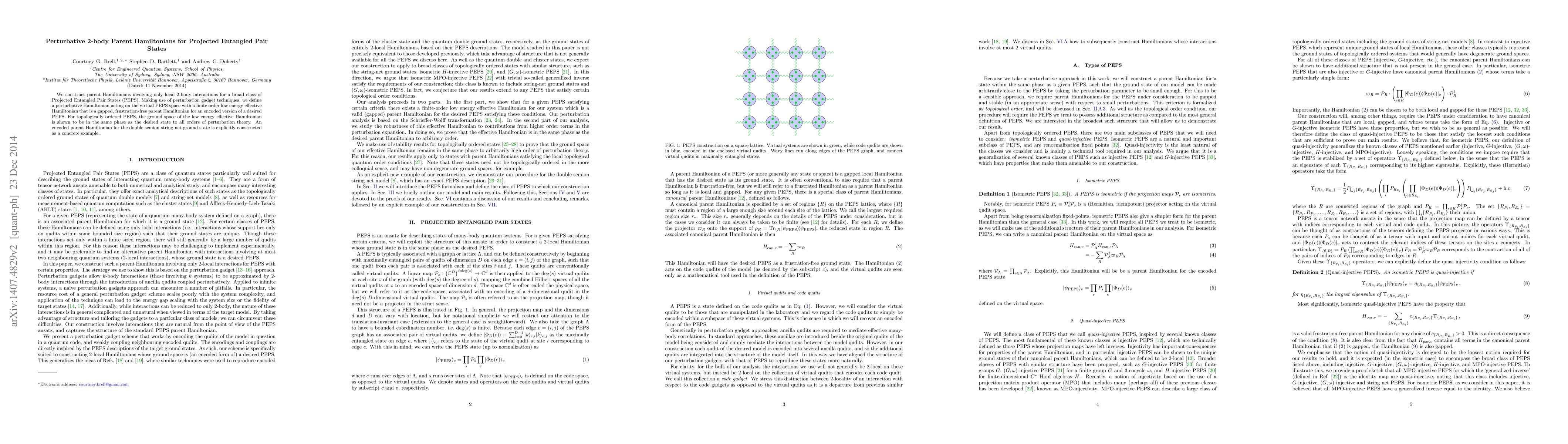 We construct parent Hamiltonians involving only local 2-body interactions for a broad class of Projected Entangled Pair States (PEPS). Making use of perturbation gadget techniques, we define a perturbative Hamiltonian acting on the virtual PEPS space with a finite order low energy effective Hamiltonian that is a gapped, frustration-free parent Hamiltonian for an encoded version of a desired PEPS. For topologically ordered PEPS, the ground space of the low energy effective Hamiltonian is shown to be in the same phase as the desired state to all orders of perturbation theory. An encoded parent Hamiltonian for the double semion string net ground state is explicitly constructed as a concrete example.