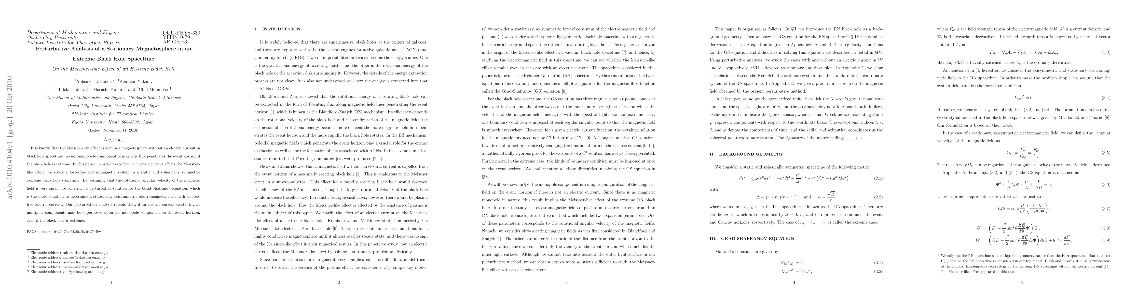 It is known that the Meissner-like effect is seen in a magnetosphere without an electric current in black hole spacetime: no non-monopole component of magnetic flux penetrates the event horizon if the black hole is extreme. In this paper, in order to see how an electric current affects the Meissner-like effect, we study a force-free electromagnetic system in a static and spherically symmetric extreme black hole spacetime. By assuming that the rotational angular velocity of the magnetic field is very small, we construct a perturbative solution for the Grad-Shafranov equation, which is the basic equation to determine a stationary, axisymmetric electromagnetic field with a force-free electric current. Our perturbation analysis reveals that, if an electric current exists, higher multipole components may be superposed upon the monopole component on the event horizon, even if the black hole is extreme.