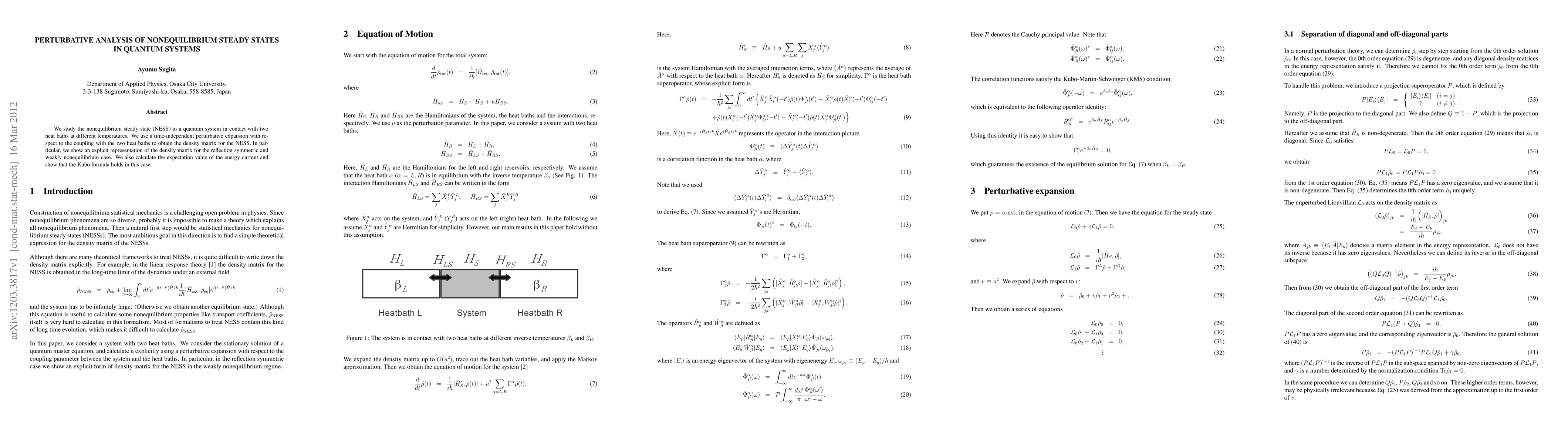 This paper investigates nonequilibrium steady states (NESS) in quantum systems connected to two heat baths of different temperatures, employing a perturbative expansion to derive the density matrix. It provides an explicit representation for the reflection symmetric, weakly nonequilibrium case and verifies the Kubo formula for energy current.