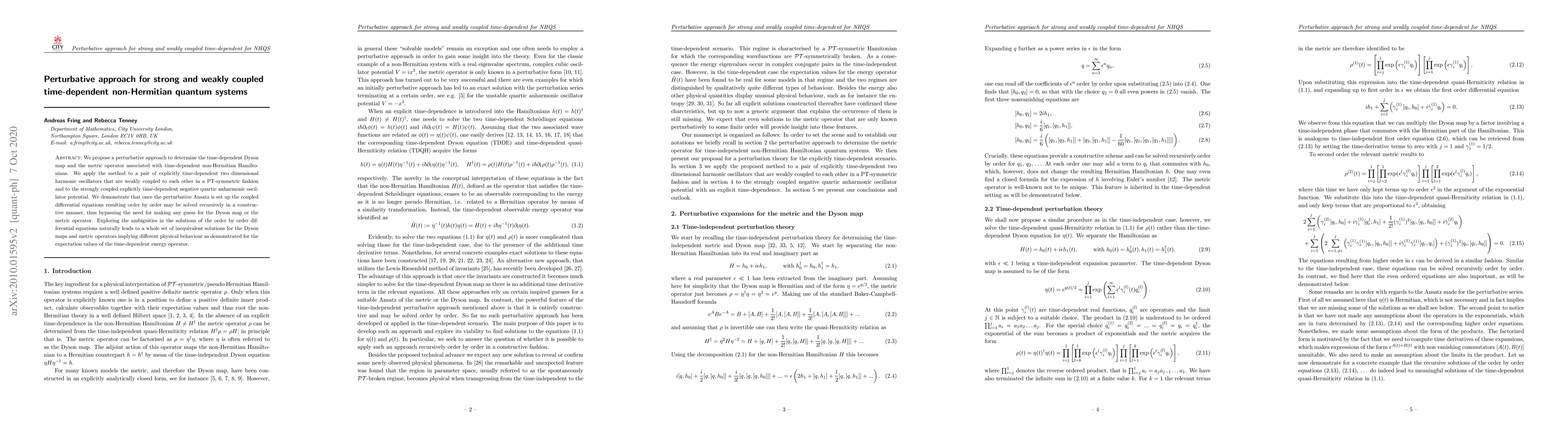 This paper introduces a perturbative method for analyzing time-dependent non-Hermitian quantum systems, applying it to weakly and strongly coupled harmonic oscillators. The approach recursively solves coupled differential equations to determine the Dyson map and metric operator without initial guesses, revealing different physical behaviors through various solutions.