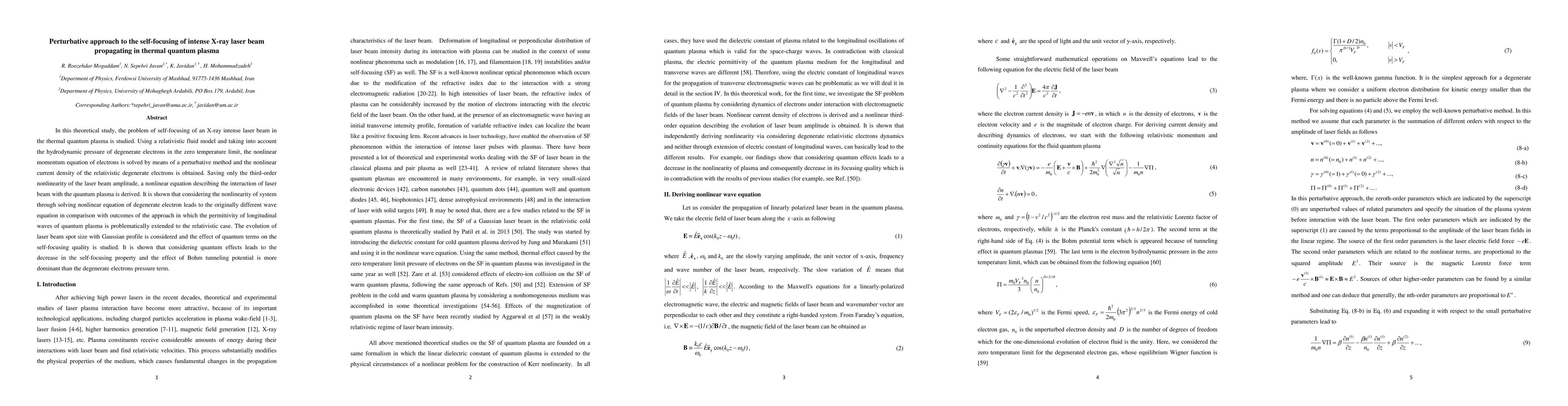 In this theoretical study, the problem of self-focusing of an X-ray intense laser beam in the thermal quantum plasma is studied. Using a relativistic fluid model and taking into account the hydrodynamic pressure of degenerate electrons in the zero temperature limit, the nonlinear momentum equation of electrons is solved by means of a perturbative method and the nonlinear current density of the relativistic degenerate electrons is obtained. Saving only the third-order nonlinearity of the laser beam amplitude, a nonlinear equation describing the interaction of laser beam with the quantum plasma is derived. It is shown that considering the nonlinearity of system through solving nonlinear equation of degenerate electron leads to the originally different wave equation in comparison with outcomes of the approach in which the permittivity of longitudinal waves of quantum plasma is problematically extended to the relativistic case. The evolution of laser beam spot size with Gaussian profile is considered and the effect of quantum terms on the self-focusing quality is studied. It is shown that considering quantum effects leads to the decrease in the self-focusing property and the effect of Bohm tunneling potential is more dominant than the degenerate electrons pressure term.