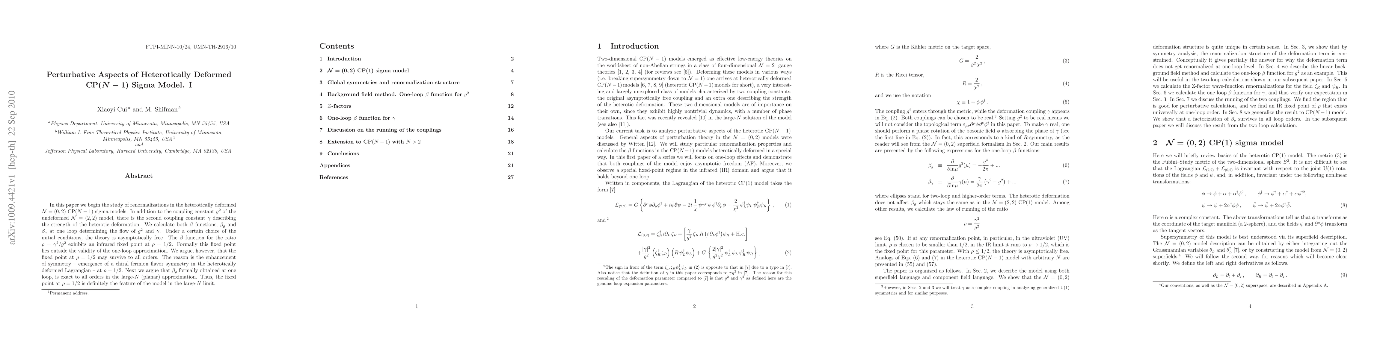 In this paper we begin the study of renormalizations in the heterotically deformed N=(0,2) CP(N-1) sigma models. In addition to the coupling constant g^2 of the undeformed N=(2,2) model, there is the second coupling constant \gamma describing the strength of the heterotic deformation. We calculate both \beta functions, \beta_g and \beta_\gamma at one loop, determining the flow of g^2 and \gamma. Under a certain choice of the initial conditions, the theory is asymptotically free. The \beta function for the ratio \rho =\gamma^2/g^2 exhibits an infrared fixed point at \rho={1}{2}. Formally this fixed point lies outside the validity of the one-loop approximation. We argue, however, that the fixed point at \rho ={1}{2} may survive to all orders. The reason is the enhancement of symmetry - emergence of a chiral fermion flavor symmetry in the heterotically deformed Lagrangian - at \rho ={1}{2}. Next we argue that \beta_\rho formally obtained at one loop, is exact to all orders in the large-N (planar) approximation. Thus, the fixed point at \rho = {1}{2} is definitely the feature of the model in the large-N limit.