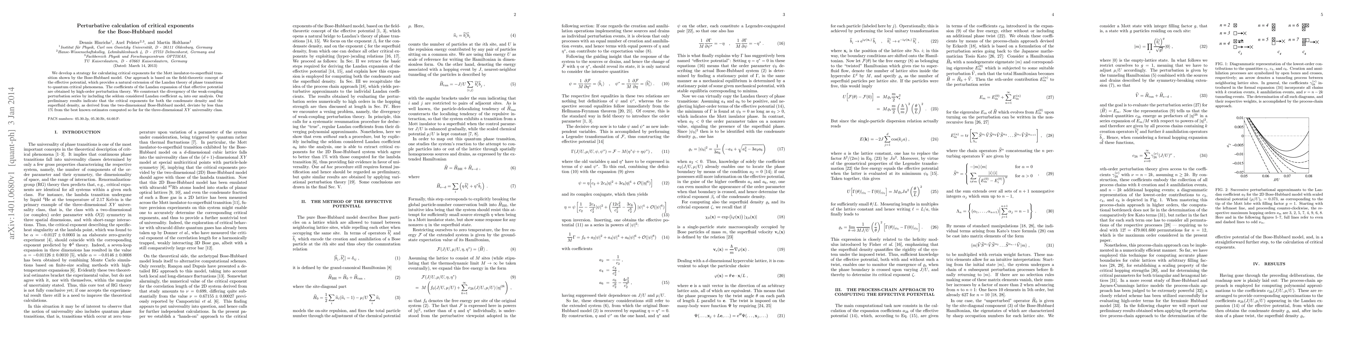 We develop a strategy for calculating critical exponents for the Mott insulator-to-superfluid transition shown by the Bose-Hubbard model. Our approach is based on the field-theoretic concept of the effective potential, which provides a natural extension of the Landau theory of phase transitions to quantum critical phenomena. The coefficients of the Landau expansion of that effective potential are obtained by high-order perturbation theory. We counteract the divergency of the weak-coupling perturbation series by including the seldom considered Landau coefficient $a_6$ into our analysis. Our preliminary results indicate that the critical exponents for both the condensate density and the superfluid density, as derived from the two-dimensional Bose-Hubbard model, deviate by less than $1\%$ from the best known estimates computed so far for the three-dimensional $XY$ universality class.