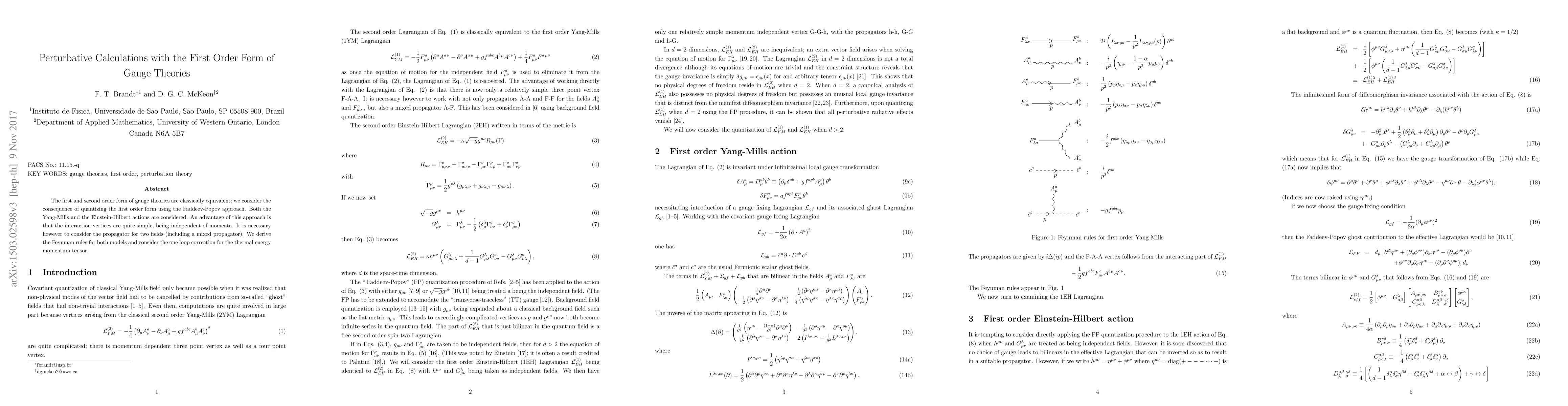 The first and second order form of gauge theories are classically equivalent; we consider the consequence of quantizing the first order form using the Faddeev-Popov approach. Both the Yang-Mills and the Einstein-Hilbert actions are considered. An advantage of this approach is that the interaction vertices are quite simple, being independent of momenta. It is necessary however to consider the propagator for two fields (including a mixed propagator). We derive the Feynman rules for both models and consider the one loop correction for the thermal energy momentum tensor.
