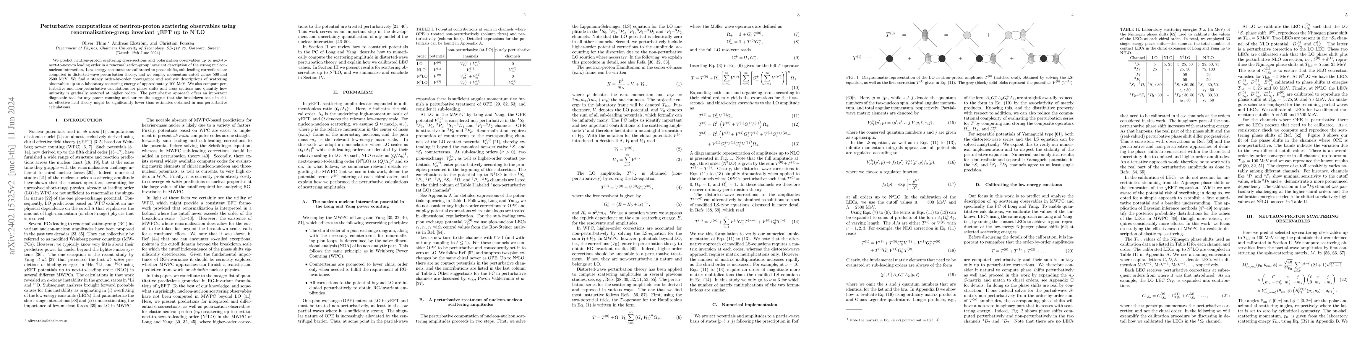 This study predicts neutron-proton scattering observables up to next-to-next-to-next-to leading order using a renormalization-group invariant chiral effective field theory. It finds improved convergence and a more realistic description of scattering observables compared to non-perturbative methods, suggesting a lower breakdown scale for chiral EFT.