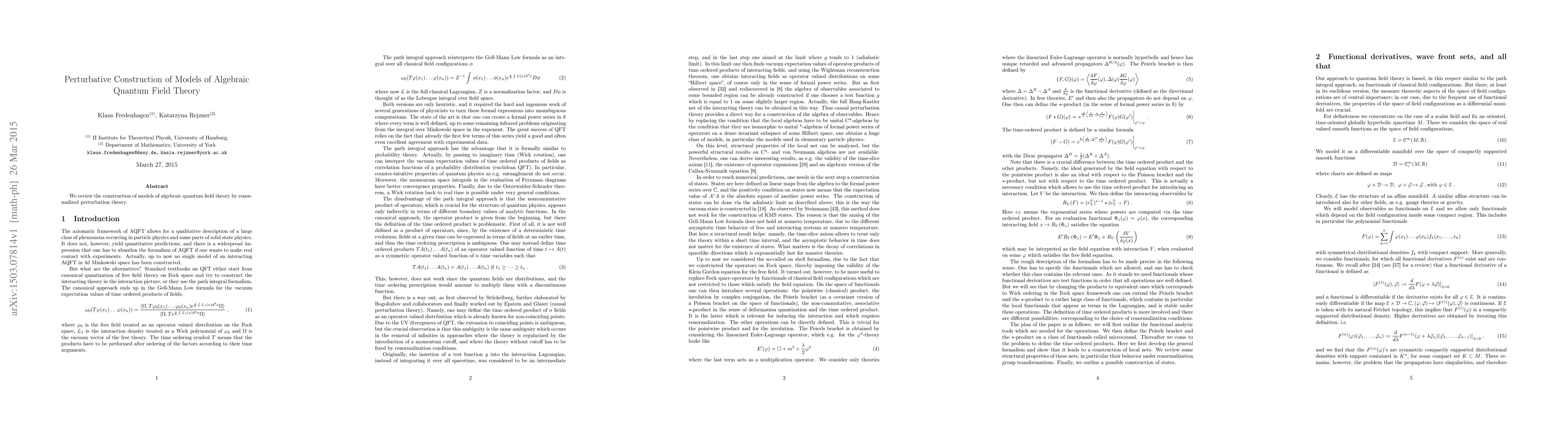 We review the construction of models of algebraic quantum field theory by renormalized perturbation theory.