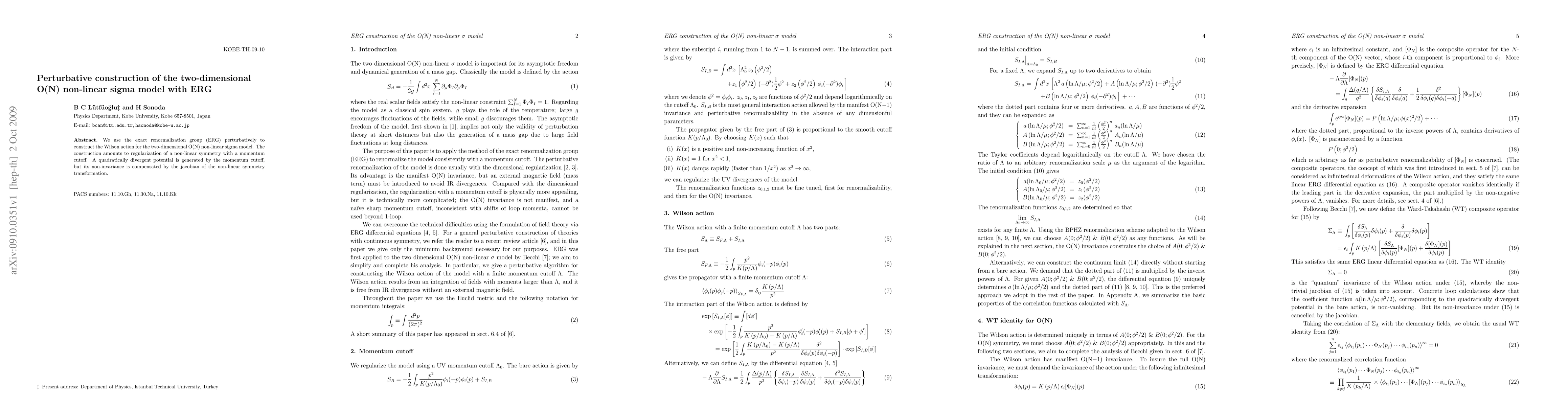 Two-line summary: This paper employs the exact renormalization group (ERG) perturbatively to construct the Wilson action for the two-dimensional O(N) non-linear sigma model, introducing a momentum cutoff for regularization. A quadratically divergent potential arises from the cutoff, but its non-invariance is compensated by the Jacobian of the non-linear symmetry transformation.