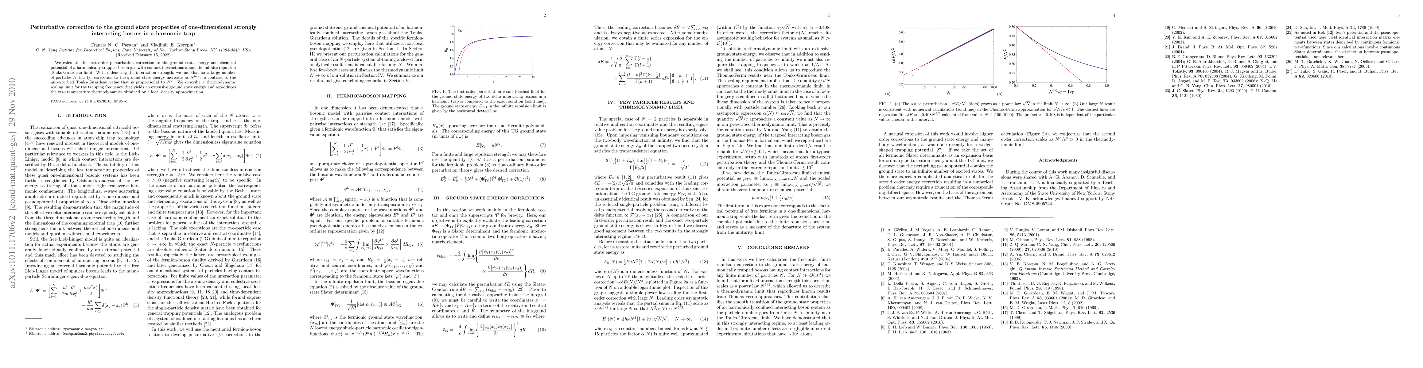 This paper calculates the first-order perturbation correction to the ground state energy and chemical potential of a strongly interacting boson gas in a harmonic trap near the infinite repulsion limit. It finds that the $1/c$ correction scales as $N^{5/2}$ for large $N$, differing from the $N^2$ scaling of the unperturbed Tonks-Girardeau limit, and describes a thermodynamic scaling limit that reproduces zero temperature thermodynamics.