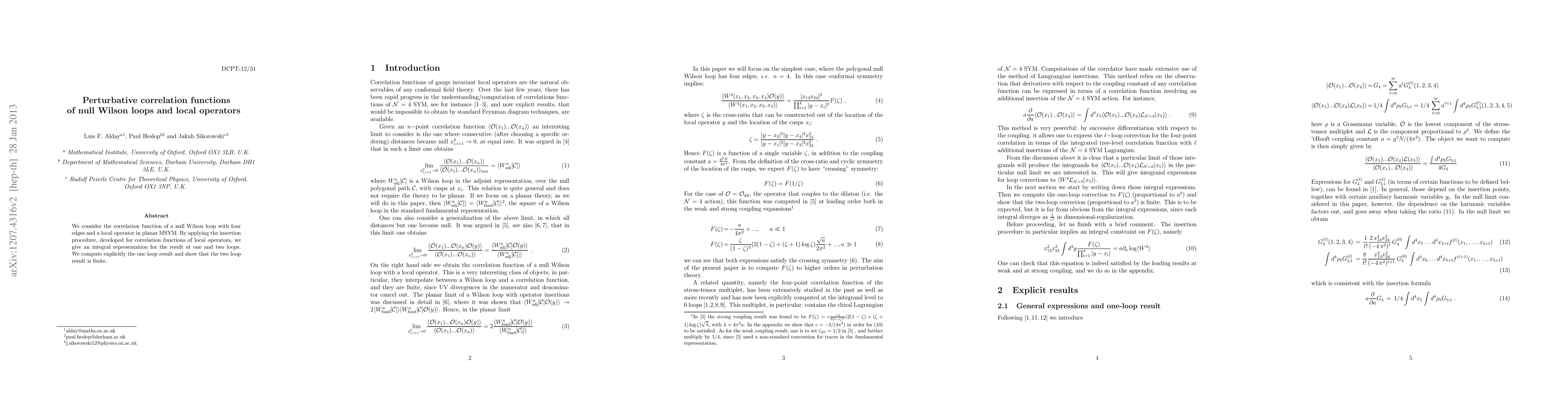 This paper investigates the correlation functions between a null Wilson loop with four edges and a local operator in planar N=4 Super Yang-Mills theory. It provides an integral representation for the correlation function at one and two loops, explicitly computing the finite one-loop result and demonstrating that the two-loop result is also finite.
