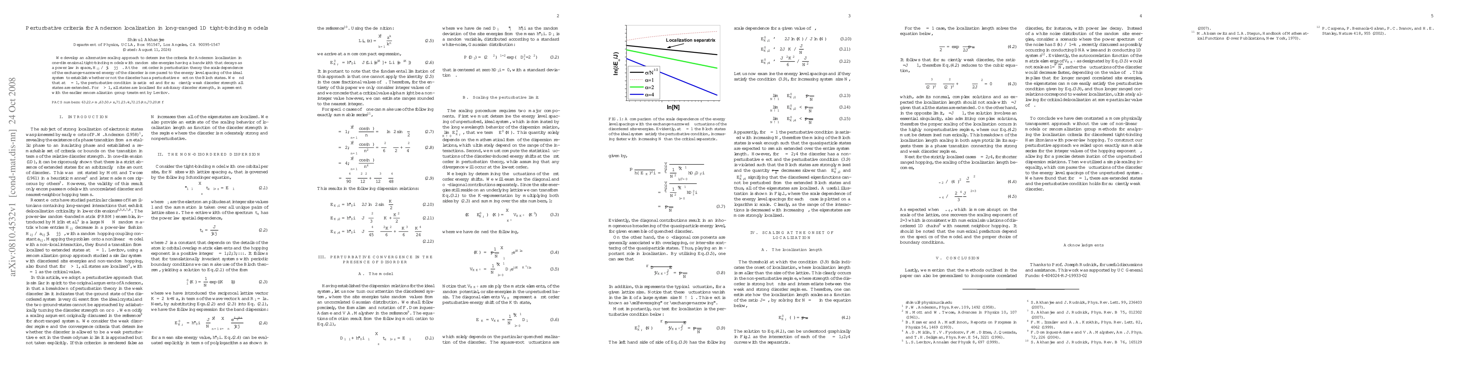 We develop an alternative scaling approach to determine the criteria for Anderson localization in one-dimensional tight-binding models with random site energies having a bandwidth that decays as a power law in space, $H_{ij} \propto |i - j|^{-\alpha}$. At the first order in perturbation theory the scale dependence of the exchange-narrowed energy of the disorder is compared to the energy level spacing of the ideal system to establish whether or not the disorder has a perturbative effect on the Bloch states. We find that at $\alpha =1$, the perturbative condition is satisfied and for sufficiently weak disorder strength all states are extended. For $\alpha > 1$, all states are localized for arbitrary disorder strength, in agreement with the earlier renormalization group treatment by Levitov.
