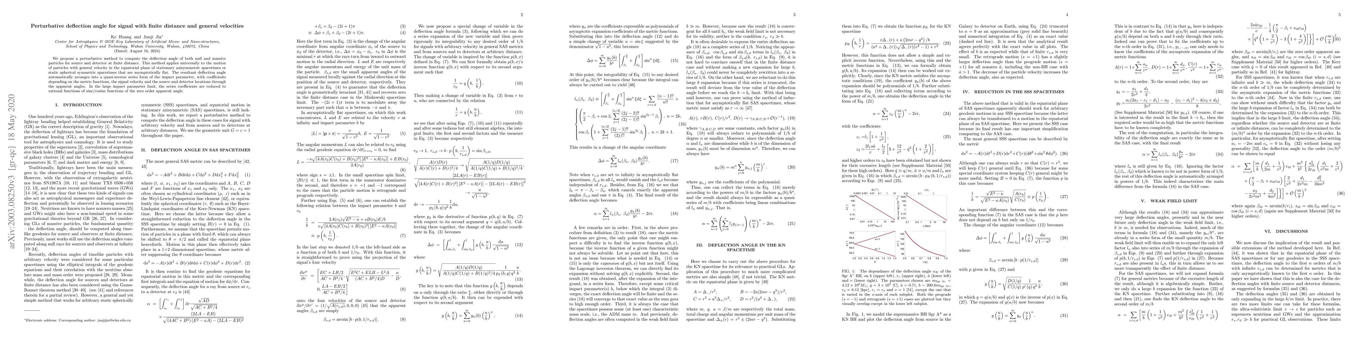 This paper introduces a perturbative method to calculate the deflection angle for both light and massive particles in asymptotically flat spacetimes, applicable to general velocities and finite source-detector distances. The deflection angle is expressed as a quasi-inverse series in the impact parameter, with coefficients dependent on metric functions, signal velocity, and apparent angles.