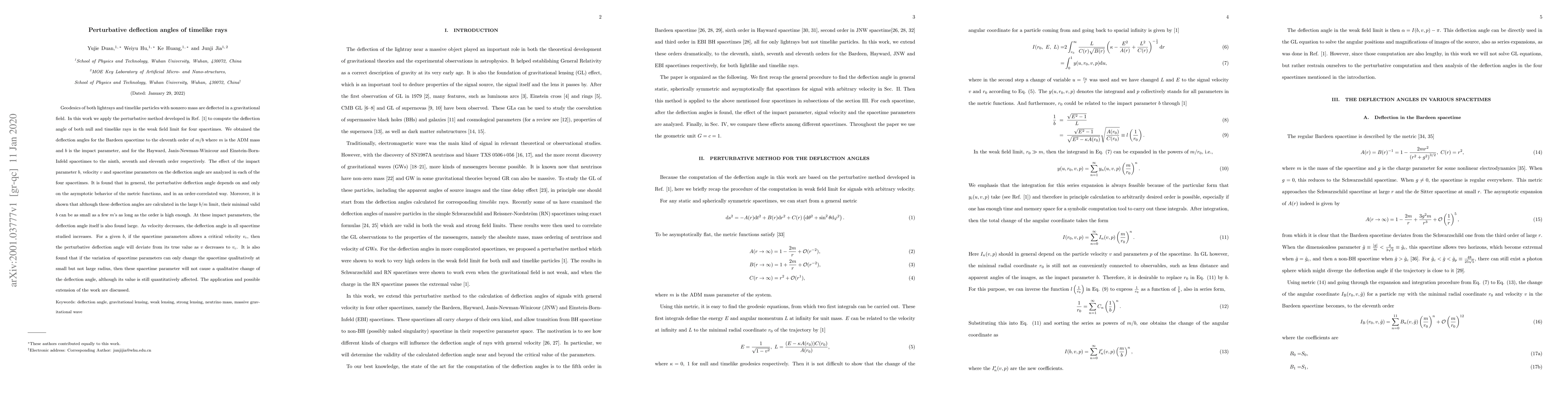This paper computes perturbative deflection angles for both light and timelike particles in weak gravitational fields across four spacetimes, finding that the deflection angle depends on the metric's asymptotic behavior and is influenced by the impact parameter, velocity, and spacetime parameters. The study reveals that lower velocities increase the deflection angle and discusses the qualitative vs. quantitative effects of spacetime parameters.