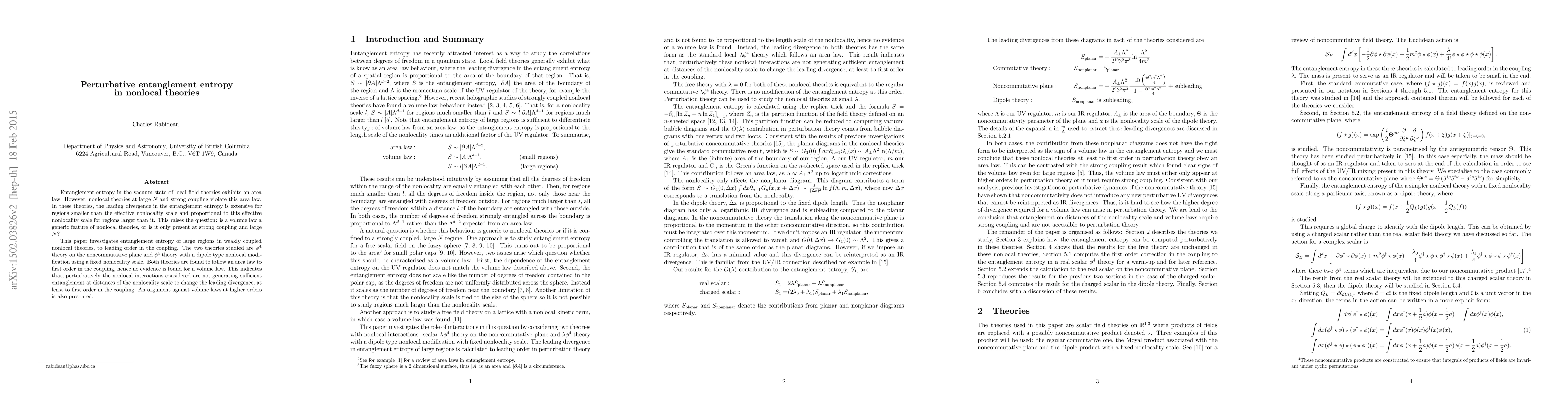 The research investigates perturbative entanglement entropy in nonlocal theories, specifically phi^4 theory on the noncommutative plane and phi^4 theory with a dipole-type nonlocal modification, both to leading order in the coupling.