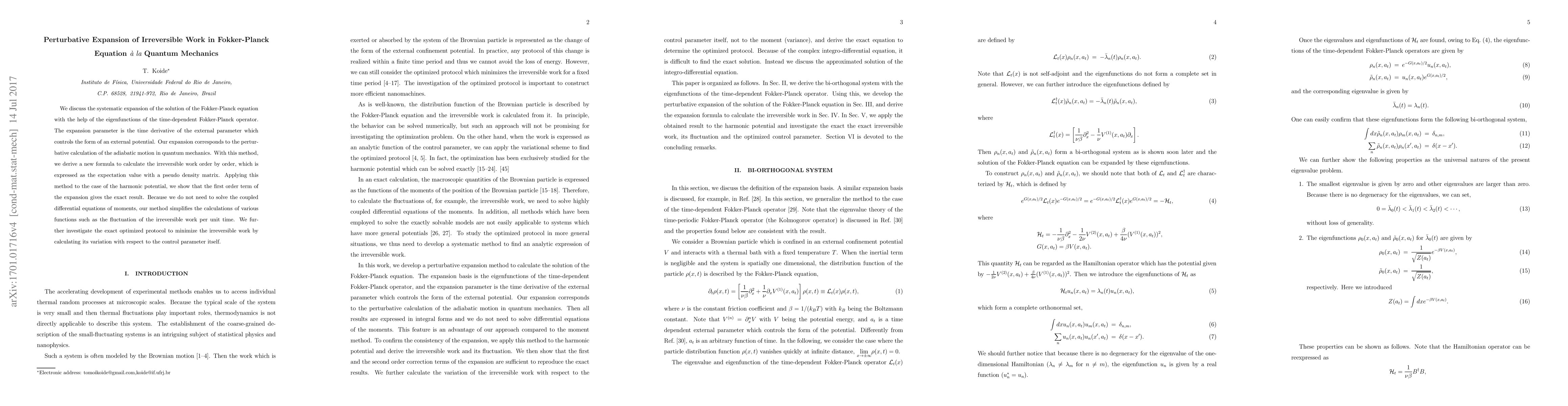 We discuss the systematic expansion of the solution of the Fokker-Planck equation with the help of the eigenfunctions of the time-dependent Fokker-Planck operator. The expansion parameter is the time derivative of the external parameter which controls the form of an external potential. Our expansion corresponds to the perturbative calculation of the adiabatic motion in quantum mechanics. With this method, we derive a new formula to calculate the irreversible work order by order, which is expressed as the expectation value with a pseudo density matrix. Applying this method to the case of the harmonic potential, we show that the first order term of the expansion gives the exact result. Because we do not need to solve the coupled differential equations of moments, our method simplifies the calculations of various functions such as the fluctuation of the irreversible work per unit time. We further investigate the exact optimized protocol to minimize the irreversible work by calculating its variation with respect to the control parameter itself.