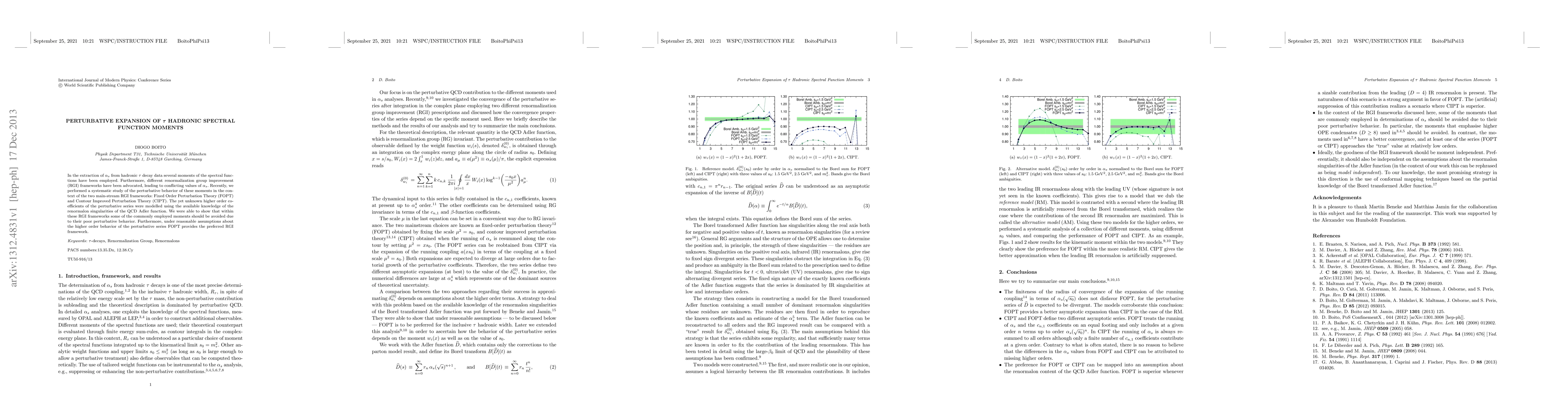 In the extraction of $\alpha_s$ from hadronic tau decay data several moments of the spectral functions have been employed. Furthermore, different renormalization group improvement (RGI) frameworks have been advocated, leading to conflicting values of $\alpha_s$. Recently, we performed a systematic study of the perturbative behavior of these moments in the context of the two main-stream RGI frameworks: Fixed Order Perturbation Theory (FOPT) and Contour Improved Perturbation Theory (CIPT). The yet unknown higher order coefficients of the perturbative series were modelled using the available knowledge of the renormalon singularities of the QCD Adler function. We were able to show that within these RGI frameworks some of the commonly employed moments should be avoided due to their poor perturbative behavior. Furthermore, under reasonable assumptions about the higher order behavior of the perturbative series FOPT provides the preferred RGI framework.