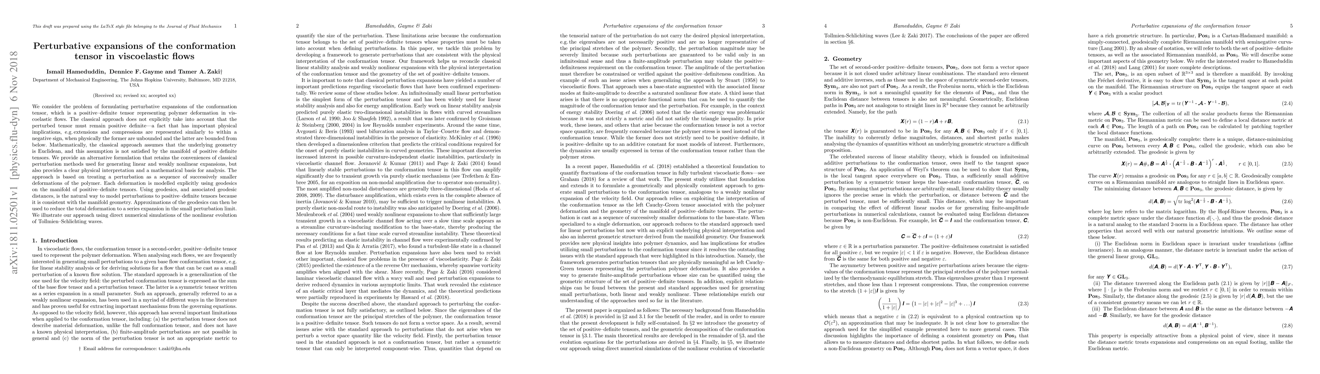We consider the problem of formulating perturbative expansions of the conformation tensor, which is a positive-definite tensor representing polymer deformation in viscoelastic flows. The classical approach does not explicitly take into account that the perturbed tensor must remain positive definite---a fact that has important physical implications, e.g. extensions and compressions are represented similarly to within a negative sign, when physically the former are unbounded and the latter are bounded from below. Mathematically, the classical approach assumes that the underlying geometry is Euclidean, and this assumption is not satisfied by the manifold of positive definite tensors. We provide an alternative formulation that retains the conveniences of classical perturbation methods used for generating linear and weakly nonlinear expansions, but also provides a clear physical interpretation and a mathematical basis for analysis. The approach is based on treating a perturbation as a sequence of successively smaller deformations of the polymer. Each deformation is modelled explicitly using geodesics on the manifold of positive-definite tensors. Using geodesics, and associated geodesic distances, is the natural way to model perturbations to positive-definite tensors because it is consistent with the manifold geometry. Approximations of the geodesics can then be used to reduce the total deformation to a series expansion in the small perturbation limit. We illustrate our approach using direct numerical simulations of the nonlinear evolution of Tollmien-Schlichting waves.