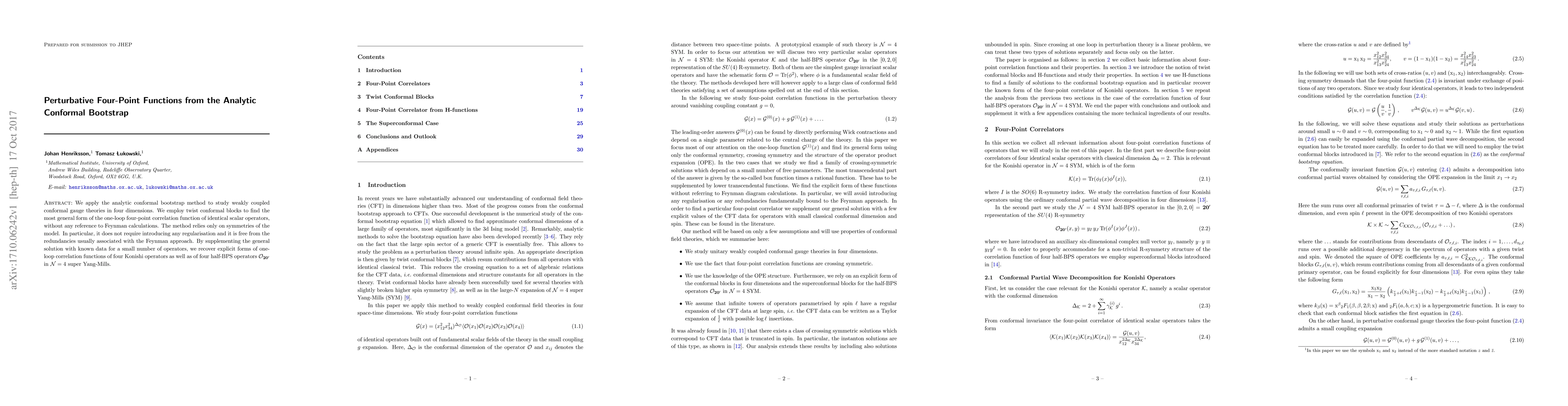We apply the analytic conformal bootstrap method to study weakly coupled conformal gauge theories in four dimensions. We employ twist conformal blocks to find the most general form of the one-loop four-point correlation function of identical scalar operators, without any reference to Feynman calculations. The method relies only on symmetries of the model. In particular, it does not require introducing any regularisation and it is free from the redundancies usually associated with the Feynman approach. By supplementing the general solution with known data for a small number of operators, we recover explicit forms of one-loop correlation functions of four Konishi operators as well as of four half-BPS operators $\mathcal{O}_{20'}$ in $\mathcal{N}=4$ super Yang-Mills.