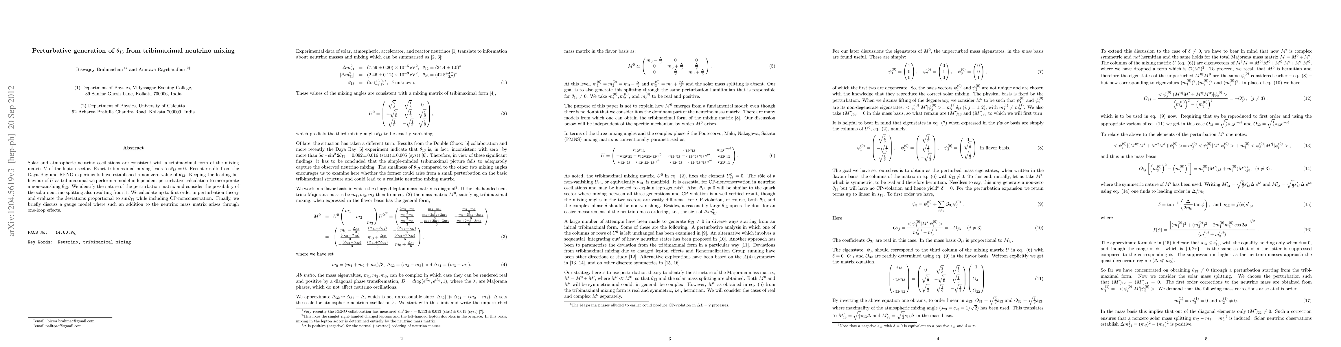 This paper investigates how to generate a non-zero $\theta_{13}$ in neutrino mixing while maintaining the tribimaximal form of the mixing matrix. It performs a perturbative calculation to incorporate $\theta_{13}$ and discusses possible sources of the perturbation, including CP-nonconservation effects and a gauge model for one-loop effects.