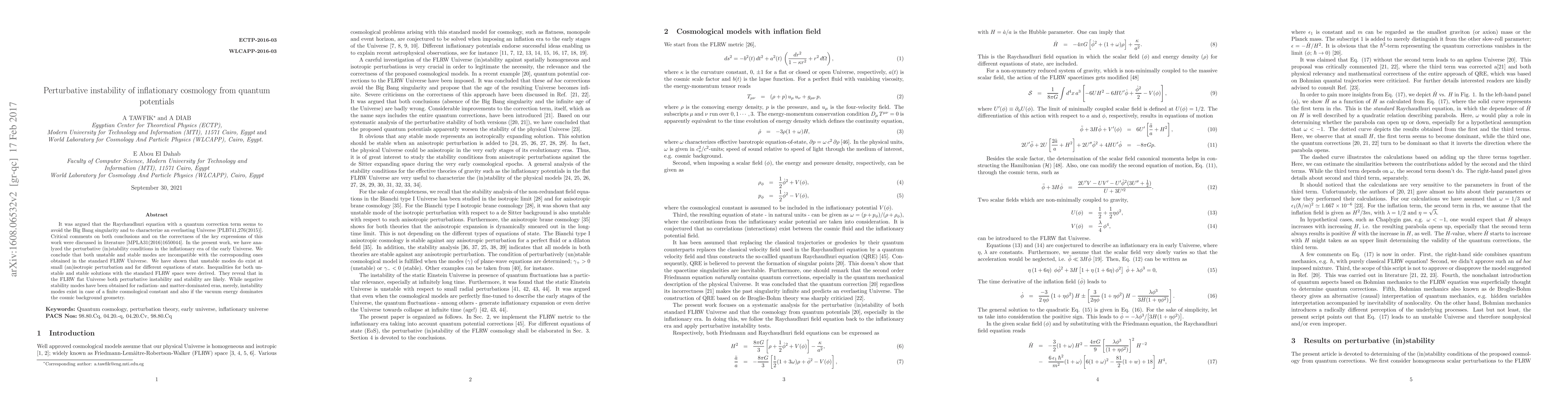 It was argued that the Raychaudhuri equation with a quantum correction term seems to avoid the Big Bang singularity and to characterize an everlasting Universe [PLB741,276(2015)]. Critical comments on both conclusions and on the correctness of the key expressions of this work were discussed in literature [MPLA31(2016)1650044]. In the present work, we have analyzed the perturbative (in)stability conditions in the inflationary era of the early Universe. We conclude that both unstable and stable modes are incompatible with the corresponding ones obtained in the standard FLRW Universe. We have shown that unstable modes do exist at small (an)isotropic perturbation and for different equations of state. Inequalities for both unstable and stable solutions with the standard FLRW space were derived. They reveal that in the FLRW flat Universe both perturbative instability and stability are likely. While negative stability modes have been obtained for radiation- and matter-dominated eras, merely, instability modes exist in case of a finite cosmological constant and also if the vacuum energy dominates the cosmic background geometry.