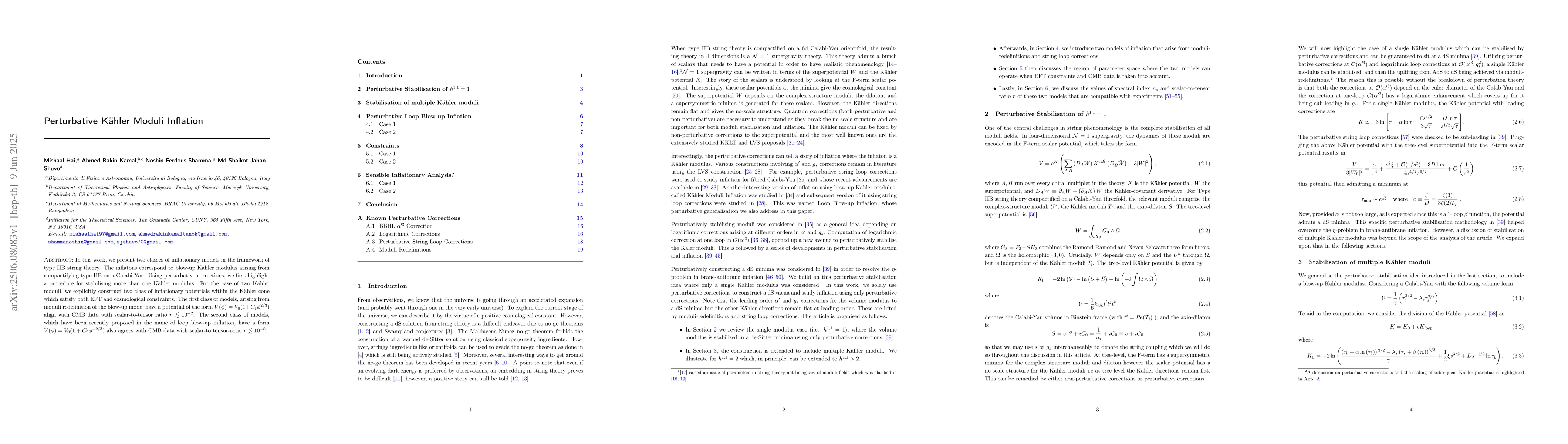 In this work, we present two classes of inflationary models in the framework of type IIB string theory. The inflatons correspond to blow-up K\"ahler modulus arising from compactifying type IIB on a Calabi-Yau. Using perturbative corrections, we first highlight a procedure for stabilising more than one K\"ahler modulus. For the case of two K\"ahler moduli, we explicitly construct two class of inflationary potentials within the K\"ahler cone which satisfy both EFT and cosmological constraints. The first class of models, arising from moduli redefinition of the blow-up mode, have a potential of the form $V(\phi)=V_0(1+C_1 \phi^{2/3})$ align with CMB data with scalar-to-tensor ratio $r\lesssim 10^{-2}$. The second class of models, which have been recently proposed in the name of loop blow-up inflation, have a form $V(\phi)=V_0(1+C_2\phi^{-2/3})$ also agrees with CMB data with scalar-to tensor-ratio $r\lesssim 10^{-8}$.