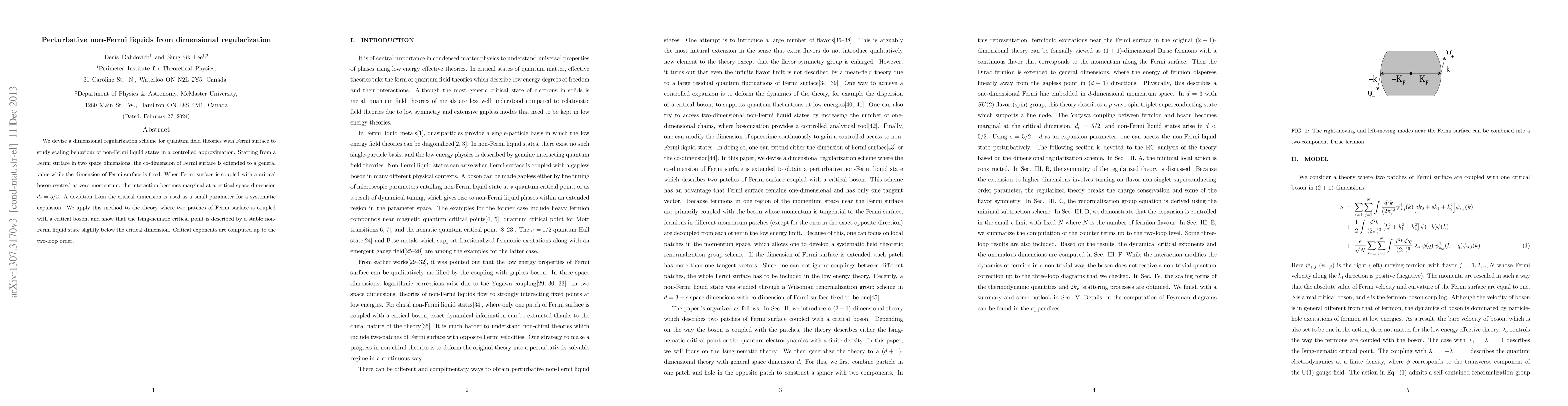 We devise a dimensional regularization scheme for quantum field theories with Fermi surface to study scaling behaviour of non-Fermi liquid states in a controlled approximation. Starting from a Fermi surface in two space dimensions, the co-dimension of Fermi surface is extended to a general value while the dimension of Fermi surface is fixed. When Fermi surface is coupled with a critical boson centered at zero momentum, the interaction becomes marginal at a critical space dimension d_c=5/2. A deviation from the critical dimension is used as a small parameter for a systematic expansion. We apply this method to the theory where two patches of Fermi surface is coupled with a critical boson, and show that the Ising-nematic critical point is described by a stable non-Fermi liquid state slightly below the critical dimension. Critical exponents are computed upto the two-loop order.