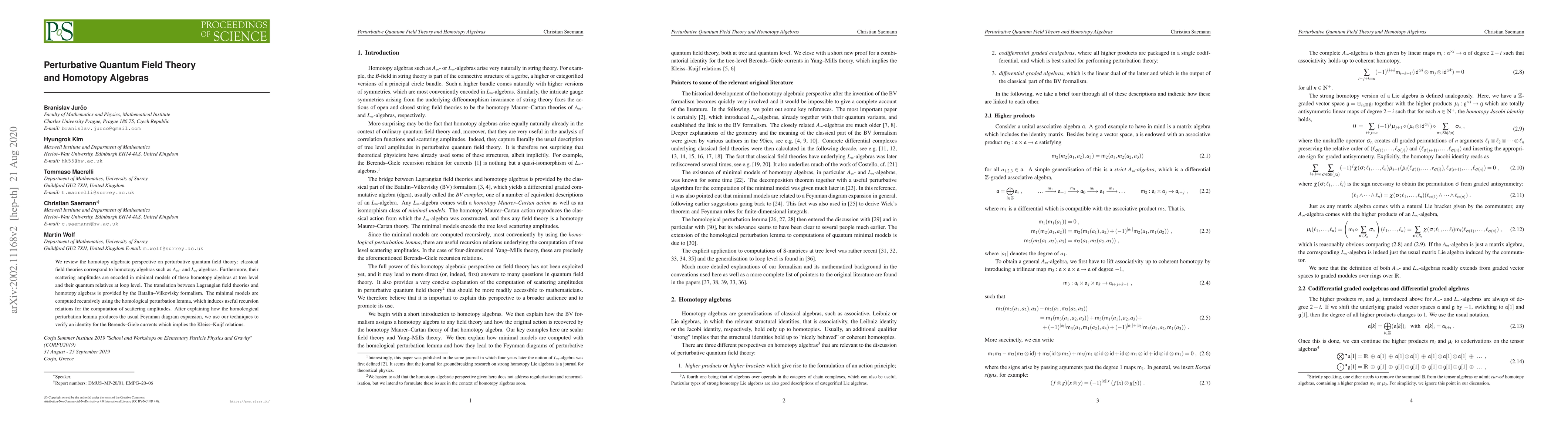 We review the homotopy algebraic perspective on perturbative quantum field theory: classical field theories correspond to homotopy algebras such as $A_\infty$- and $L_\infty$-algebras. Furthermore, their scattering amplitudes are encoded in minimal models of these homotopy algebras at tree level and their quantum relatives at loop level. The translation between Lagrangian field theories and homotopy algebras is provided by the Batalin--Vilkovisky formalism. The minimal models are computed recursively using the homological perturbation lemma, which induces useful recursion relations for the computation of scattering amplitudes. After explaining how the homological perturbation lemma produces the usual Feynman diagram expansion, we use our techniques to verify an identity for the Berends--Giele currents which implies the Kleiss--Kuijf relations.