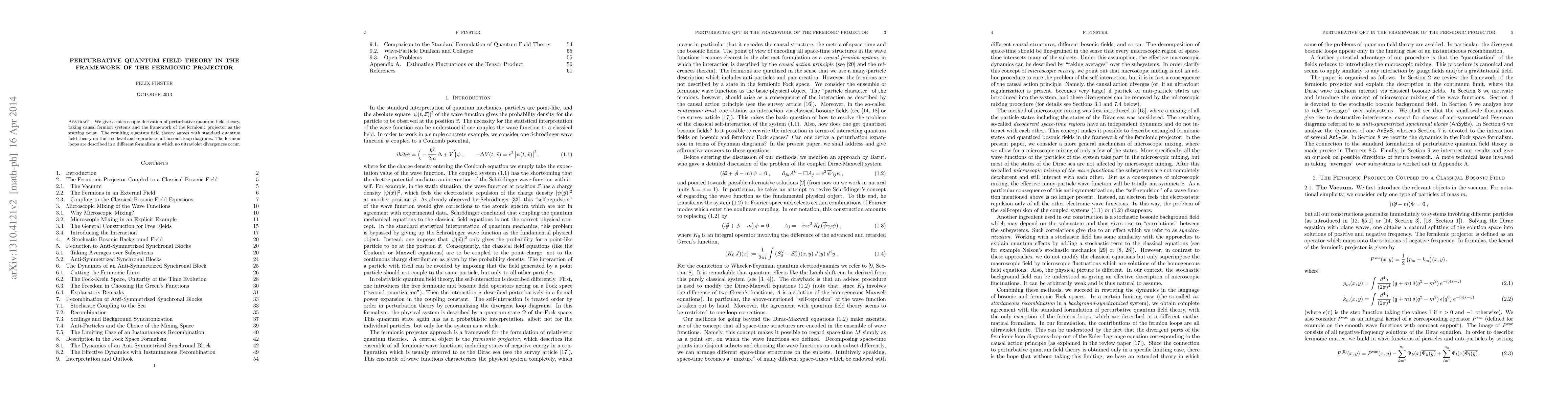 This paper derives perturbative quantum field theory using causal fermion systems and the fermionic projector, aligning with standard quantum field theory at the tree level and avoiding ultraviolet divergences in fermion loop descriptions.