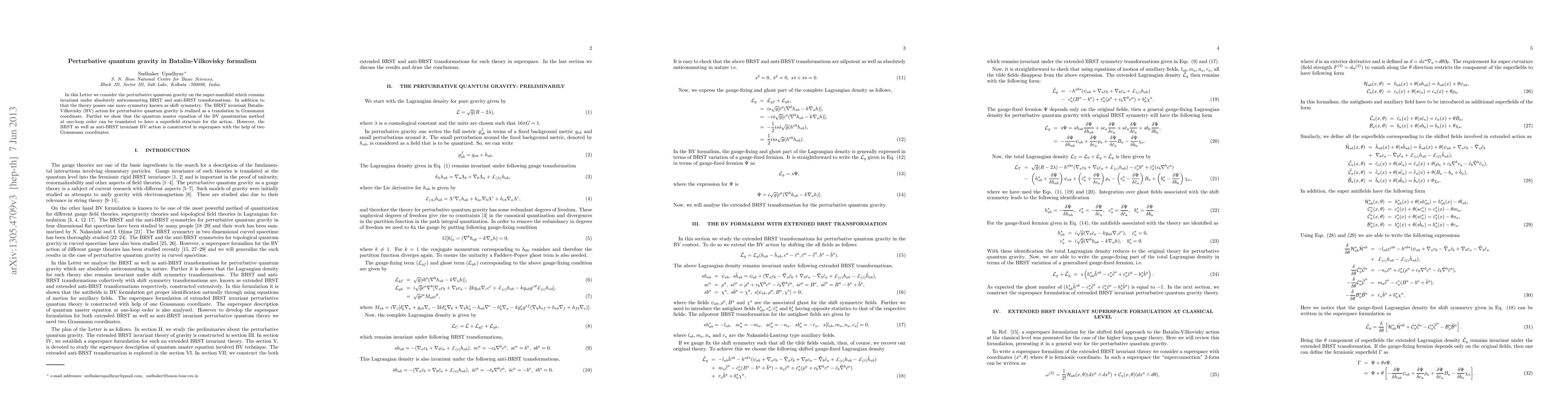 This paper explores perturbative quantum gravity using the Batalin-Vilkovisky (BV) formalism on a super-manifold, demonstrating invariance under BRST and anti-BRST transformations along with a shift symmetry. The BV action is shown to have a superfield structure at one-loop order, constructed in superspace with two Grassmann coordinates.