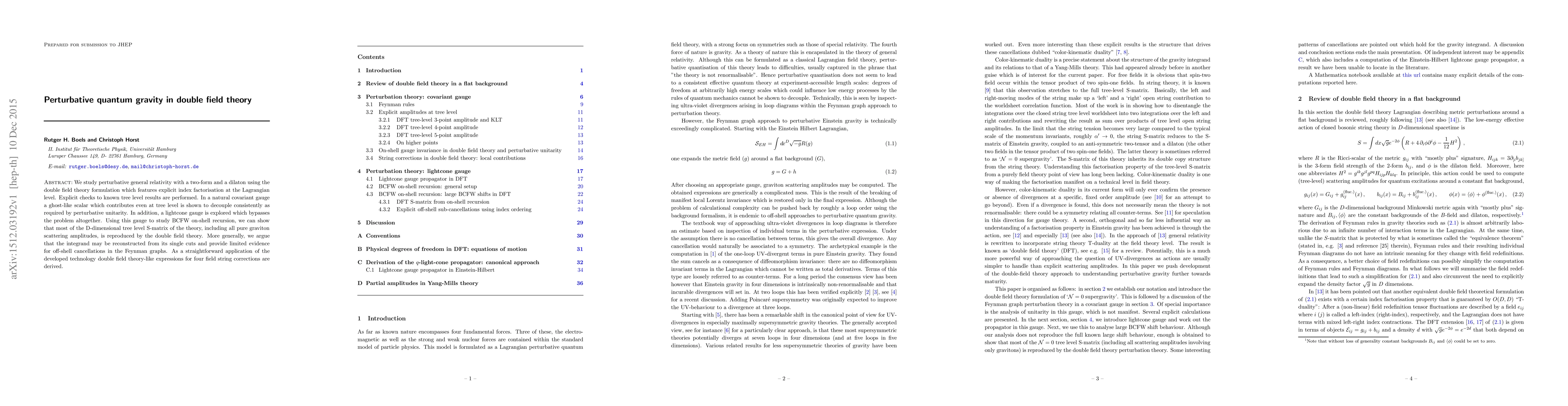 We study perturbative general relativity with a two-form and a dilaton using the double field theory formulation which features explicit index factorisation at the Lagrangian level. Explicit checks to known tree level results are performed. In a natural covariant gauge a ghost-like scalar which contributes even at tree level is shown to decouple consistently as required by perturbative unitarity. In addition, a lightcone gauge is explored which bypasses the problem altogether. Using this gauge to study BCFW on-shell recursion, we can show that most of the D-dimensional tree level S-matrix of the theory, including all pure graviton scattering amplitudes, is reproduced by the double field theory. More generally, we argue that the integrand may be reconstructed from its single cuts and provide limited evidence for off-shell cancellations in the Feynman graphs. As a straightforward application of the developed technology double field theory-like expressions for four field string corrections are derived.