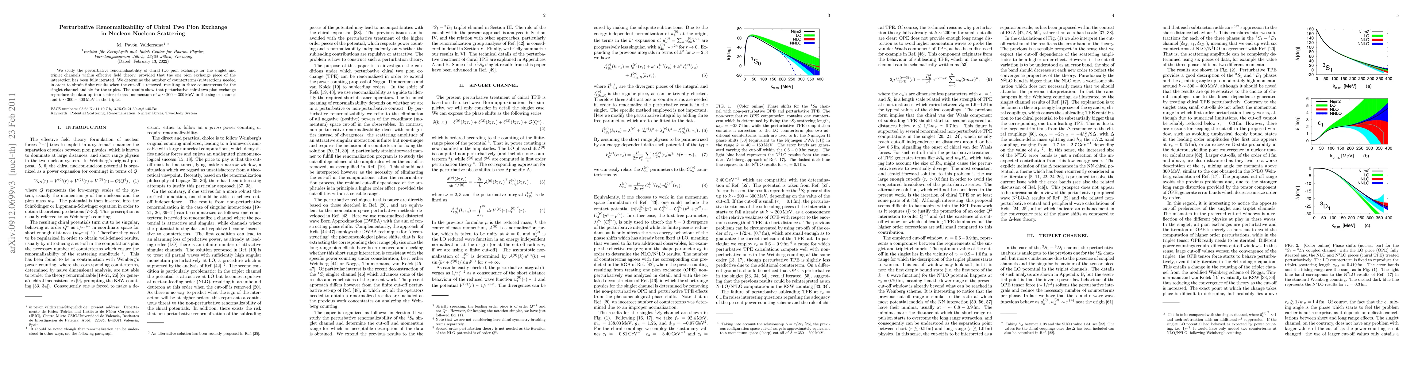 This paper investigates the perturbative renormalizability of chiral two pion exchange in nucleon-nucleon scattering, finding three counterterms for the singlet channel and six for the triplet, allowing for perturbative treatment up to specific momentum ranges.