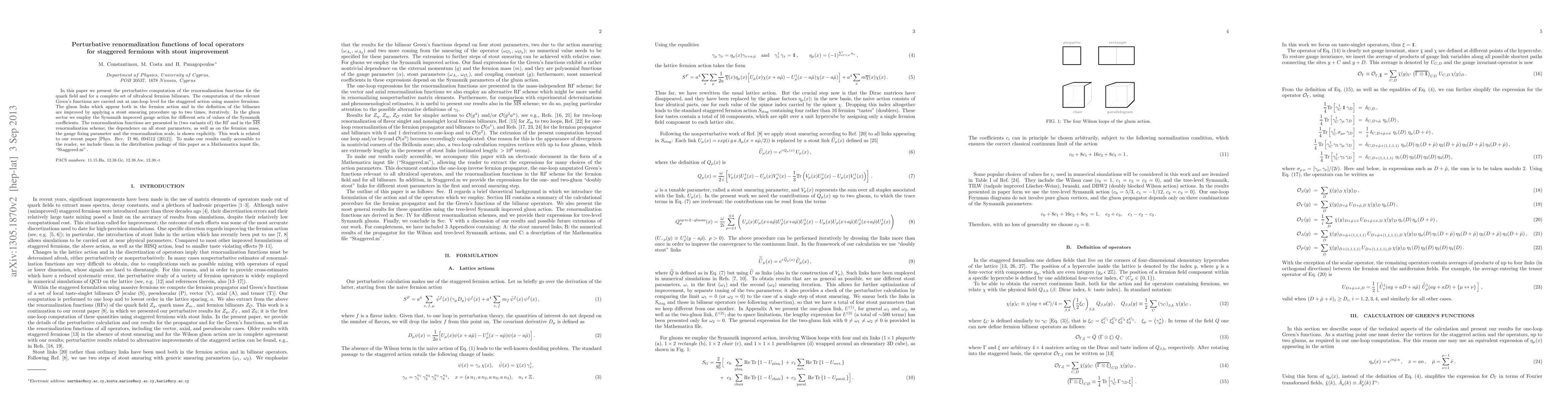 This paper computes perturbative renormalization functions for quark fields and fermion bilinears in staggered fermions with stout improvement at 1-loop level. The results are presented in RI' and MSbar schemes, including the effects of stout smearing and various parameters.