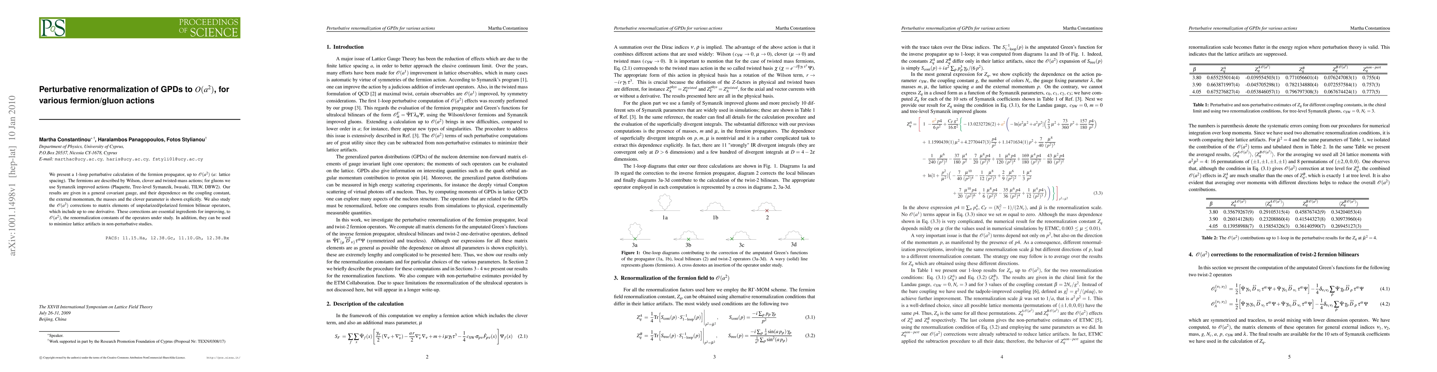 This research calculates 1-loop perturbative corrections to fermion propagators and matrix elements up to O(a^2) for various fermion and gluon actions, aiming to improve renormalization constants and minimize lattice artifacts. The study details dependencies on coupling constants, momenta, masses, and clover parameters.
