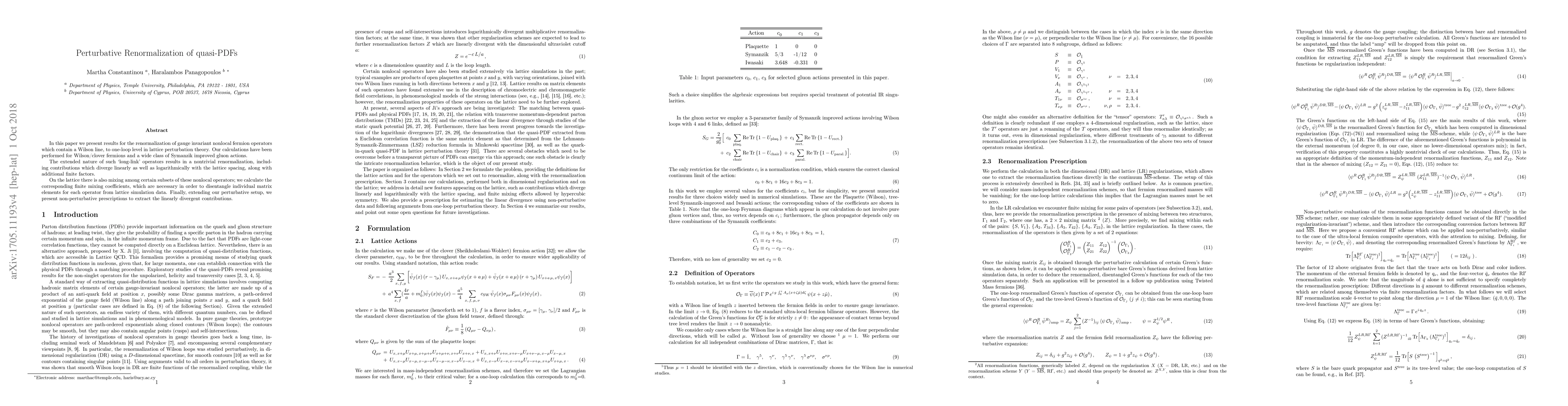 In this paper we present results for the renormalization of gauge invariant nonlocal fermion operators which contain a Wilson line, to one-loop level in lattice perturbation theory. Our calculations have been performed for Wilson/clover fermions and a wide class of Symanzik improved gluon actions. The extended nature of such long-link operators results in a nontrivial renormalization, including contributions which diverge linearly as well as logarithmically with the lattice spacing, along with additional finite factors. On the lattice there is also mixing among certain subsets of these nonlocal operators; we calculate the corresponding finite mixing coefficients, which are necessary in order to disentangle individual matrix elements for each operator from lattice simulation data. Finally, extending our perturbative setup, we present non-perturbative prescriptions to extract the linearly divergent contributions.