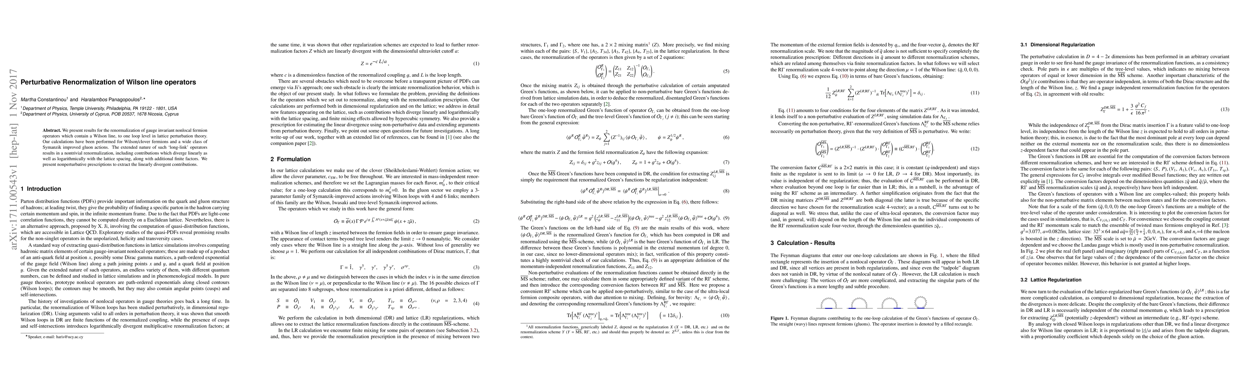 We present results for the renormalization of gauge invariant nonlocal fermion operators which contain a Wilson line, to one loop level in lattice perturbation theory. Our calculations have been performed for Wilson/clover fermions and a wide class of Symanzik improved gluon actions. The extended nature of such `long-link' operators results in a nontrivial renormalization, including contributions which diverge linearly as well as logarithmically with the lattice spacing, along with additional finite factors. We present nonperturbative prescriptions to extract the linearly divergent contributions.