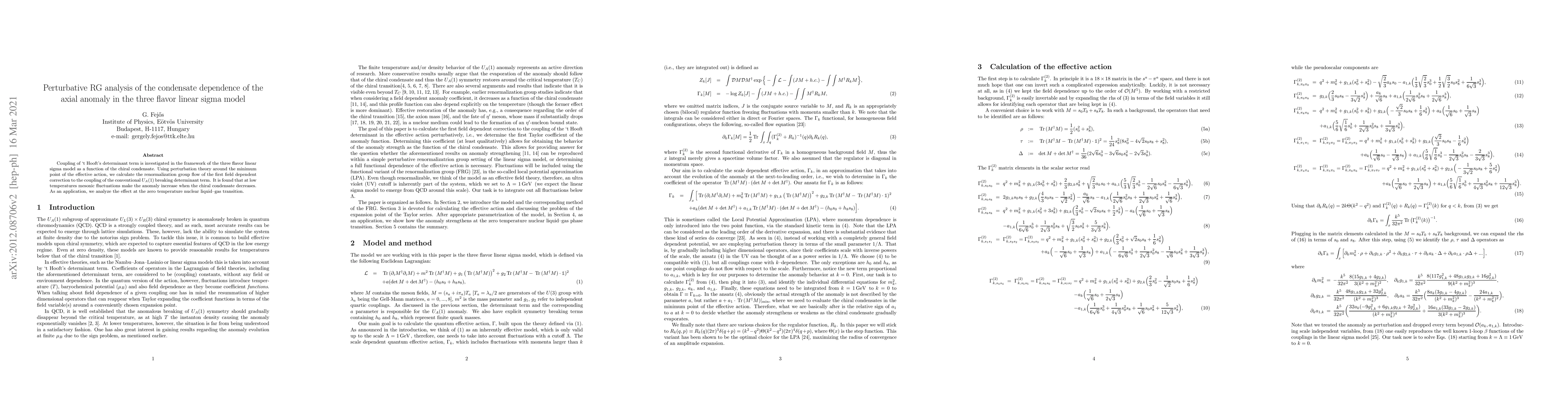 This paper investigates the axial anomaly in the three flavor linear sigma model, finding that mesonic fluctuations increase the anomaly as the chiral condensate decreases. The study uses perturbative renormalization group analysis to explore the coupling of the `t Hooft determinant term, with implications for the zero temperature nuclear liquid-gas transition.
