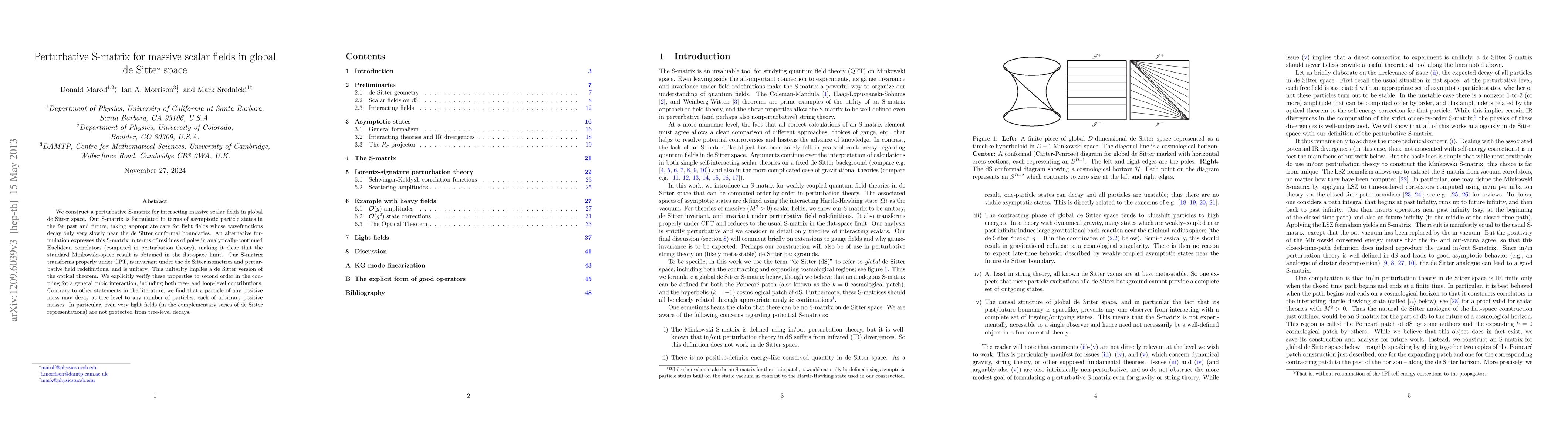This paper constructs a perturbative S-matrix for massive scalar fields in global de Sitter space, ensuring it is unitary and invariant under CPT and de Sitter isometries. Contrary to prior claims, it shows that even very light fields can decay at tree level to any number of particles with arbitrary masses.