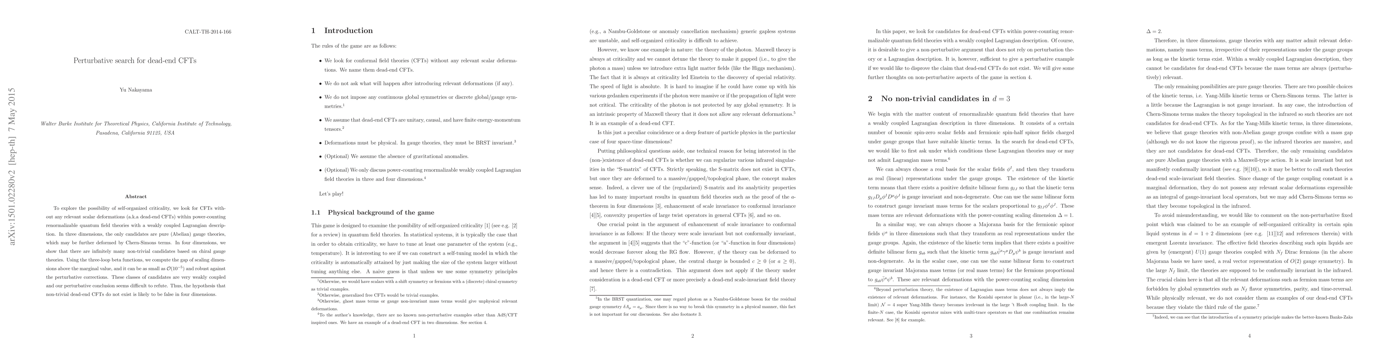 To explore the possibility of self-organized criticality, we look for CFTs without any relevant scalar deformations (a.k.a dead-end CFTs) within power-counting renormalizable quantum field theories with a weakly coupled Lagrangian description. In three dimensions, the only candidates are pure (Abelian) gauge theories, which may be further deformed by Chern-Simons terms. In four dimensions, we show that there are infinitely many non-trivial candidates based on chiral gauge theories. Using the three-loop beta functions, we compute the gap of scaling dimensions above the marginal value, and it can be as small as $\mathcal{O}(10^{-5})$ and robust against the perturbative corrections. These classes of candidates are very weakly coupled and our perturbative conclusion seems difficult to refute. Thus, the hypothesis that non-trivial dead-end CFTs do not exist is likely to be false in four dimensions.