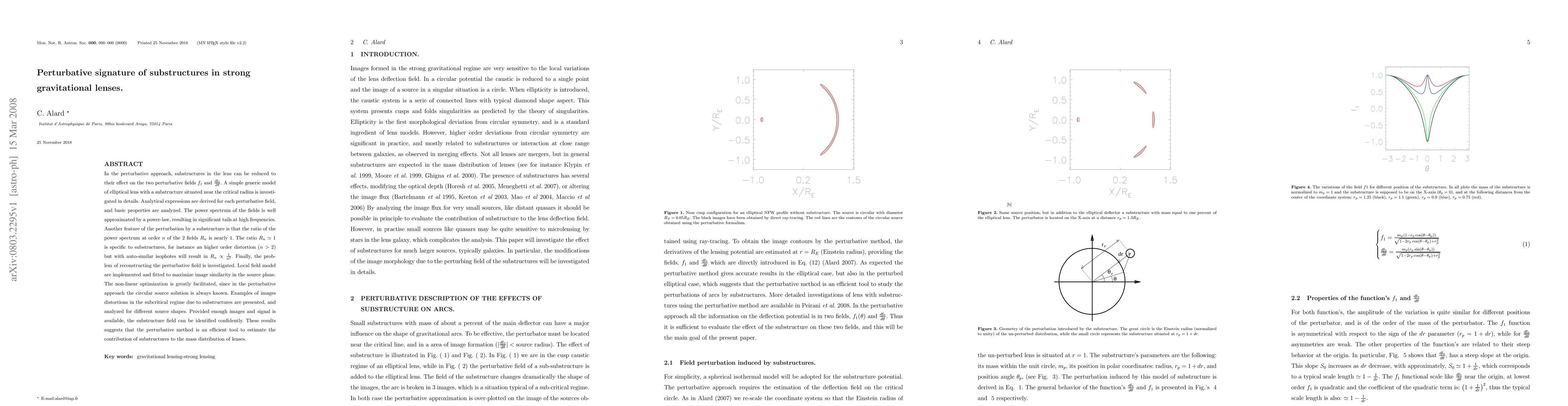 In the perturbative approach, substructures in the lens can be reduced to their effect on the two perturbative fields $f_1$ and $\frac{d f_0}{d\theta}$. A simple generic model of elliptical lens with a substructure situated near the critical radius is investigated in details. Analytical expressions are derived for each perturbative field, and basic properties are analyzed. The power spectrum of the fields is well approximated by a power-law, resulting in significant tails at high frequencies. Another feature of the perturbation by a substructure is that the ratio of the power spectrum at order $n$ of the 2 fields $R_n$ is nearly 1. The ratio $R_n \simeq 1$ is specific to substructures, for instance an higher order distortion ($n>2$) but with auto-similar isophotes will result in $R_n \propto \frac{1}{n^2}$. Finally, the problem of reconstructing the perturbative field is investigated. Local field model are implemented and fitted to maximize image similarity in the source plane. The non-linear optimization is greatly facilitated, since in the perturbative approach the circular source solution is always known. Examples of images distortions in the subcritical regime due to substructures are presented, and analyzed for different source shapes. Provided enough images and signal is available, the substructure field can be identified confidently. These results suggests that the perturbative method is an efficient tool to estimate the contribution of substructures to the mass distribution of lenses.