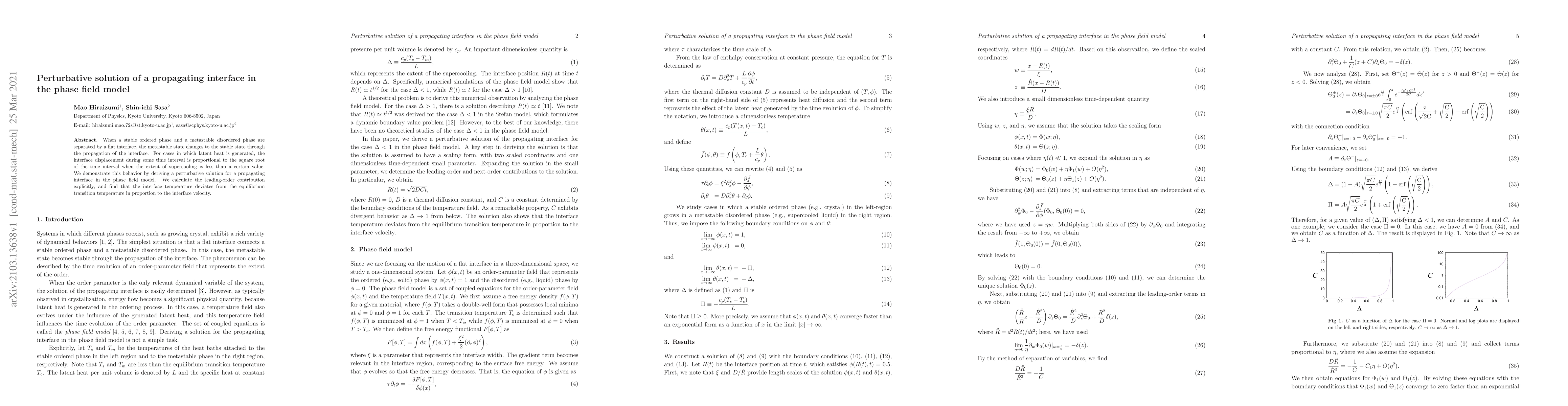 This research derives a perturbative solution for a propagating interface in the phase field model, showing that for small supercooling, interface displacement is proportional to the square root of time. The study finds that interface temperature deviates from equilibrium in proportion to the interface velocity.