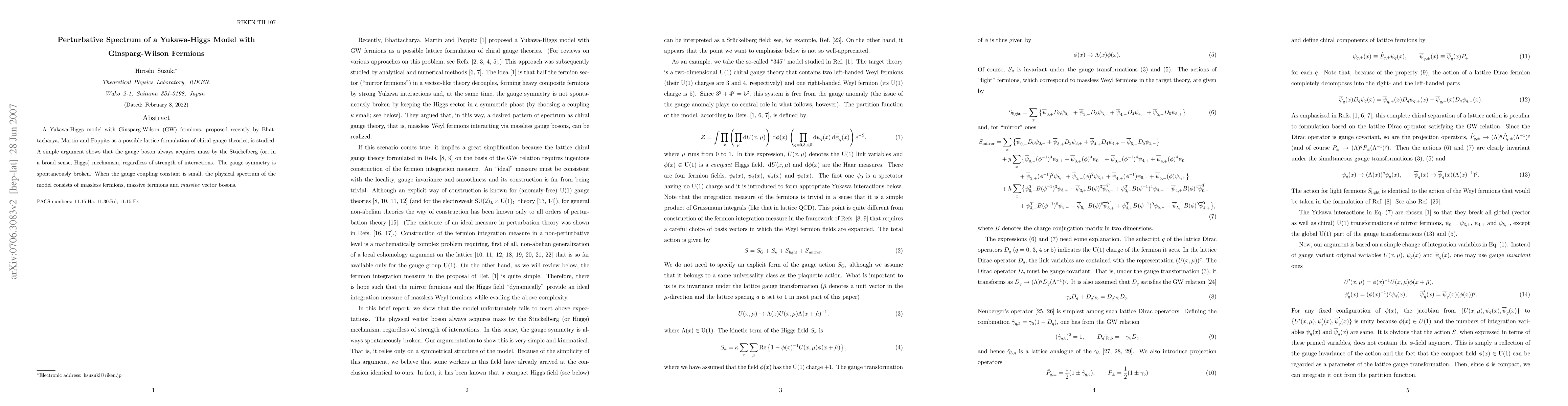 This paper investigates a Yukawa-Higgs model incorporating Ginsparg-Wilson fermions, revealing that the gauge boson acquires mass via the St\"uckelberg mechanism, leading to spontaneous symmetry breaking. The perturbative spectrum includes massless fermions, massive fermions, and massive vector bosons when the gauge coupling is weak.