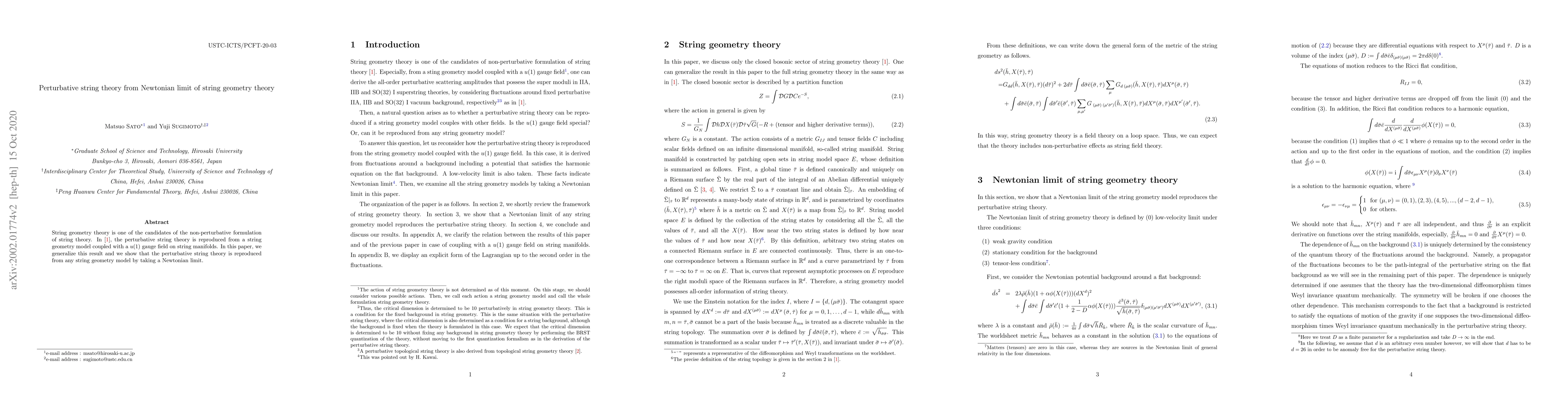 This paper generalizes the reproduction of perturbative string theory from a string geometry model by demonstrating that any such model yields perturbative string theory when taken to its Newtonian limit. This extends previous results from a specific $u(1)$ gauge field model to a broader framework.