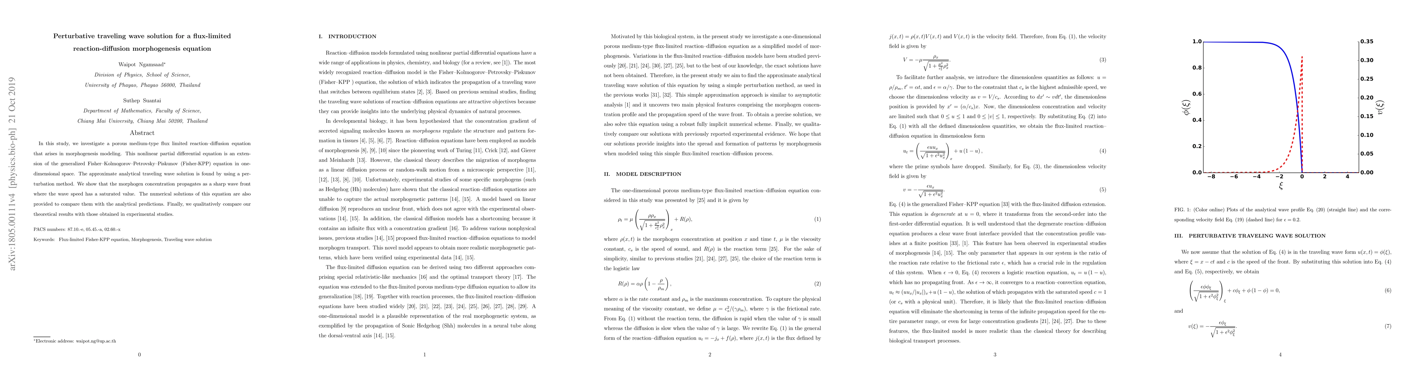 This research derives an approximate analytical traveling wave solution for a modified reaction-diffusion equation using a perturbation method, showing a saturated wave speed for morphogen concentration propagation. Numerical solutions are compared for validation, and theoretical results are qualitatively compared with experimental studies in morphogenesis modeling.
