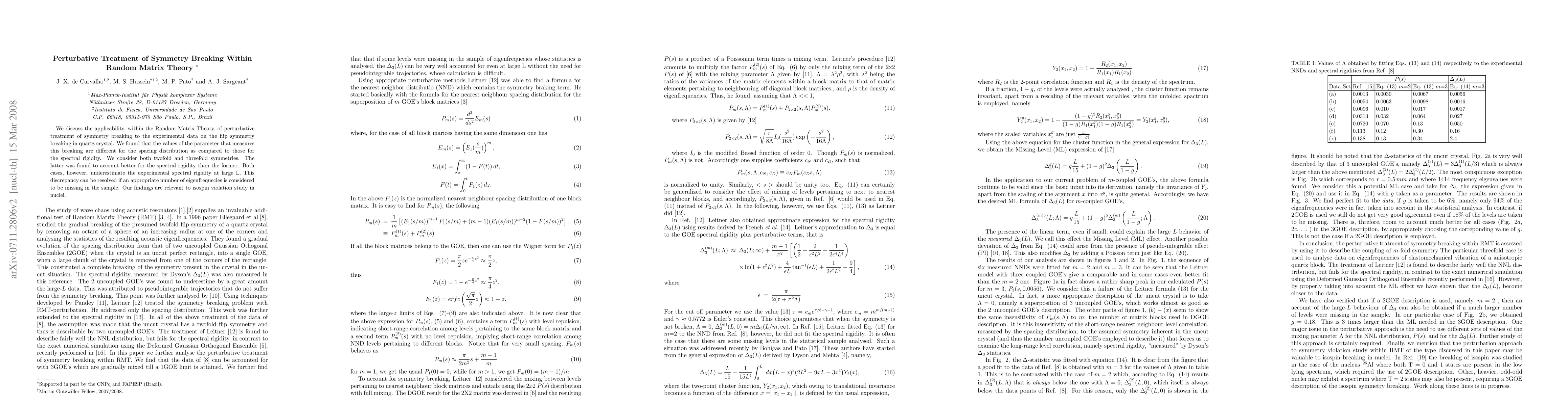 This paper explores the perturbative treatment of symmetry breaking in Random Matrix Theory, applying it to experimental data on flip symmetry breaking in quartz crystal. It reveals differences in symmetry breaking parameters for spacing distribution and spectral rigidity, with threefold symmetry providing a better fit for spectral rigidity, though both underestimate experimental values at large L, suggesting missing eigenfrequencies in the sample.