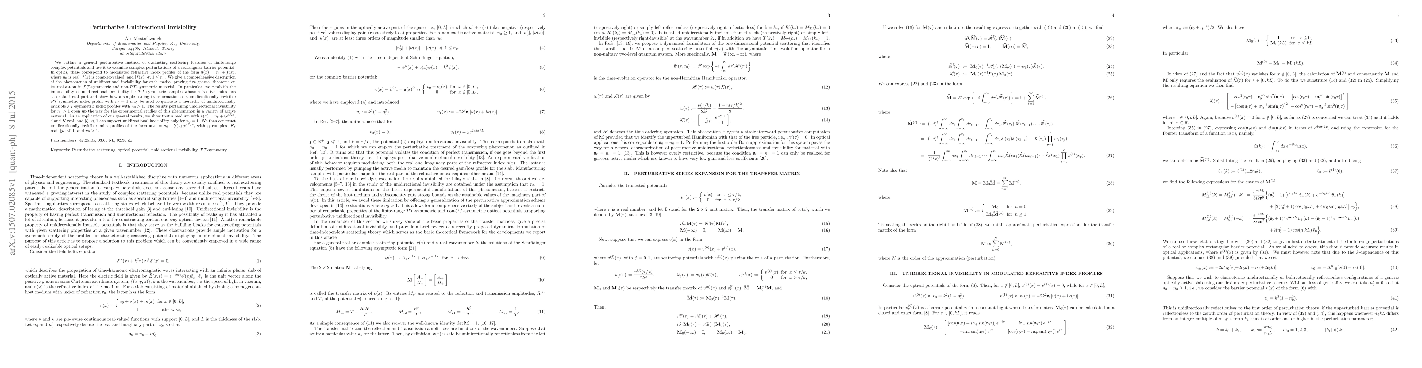 This paper develops a perturbative method to analyze scattering features of complex potentials, specifically examining modulated refractive index profiles in optics. It proves theorems on unidirectional invisibility in ${\cal PT}$-symmetric and non-${\cal PT}$-symmetric materials, showing that unidirectional invisibility is impossible for ${\cal PT}$-symmetric samples with a constant real part refractive index.