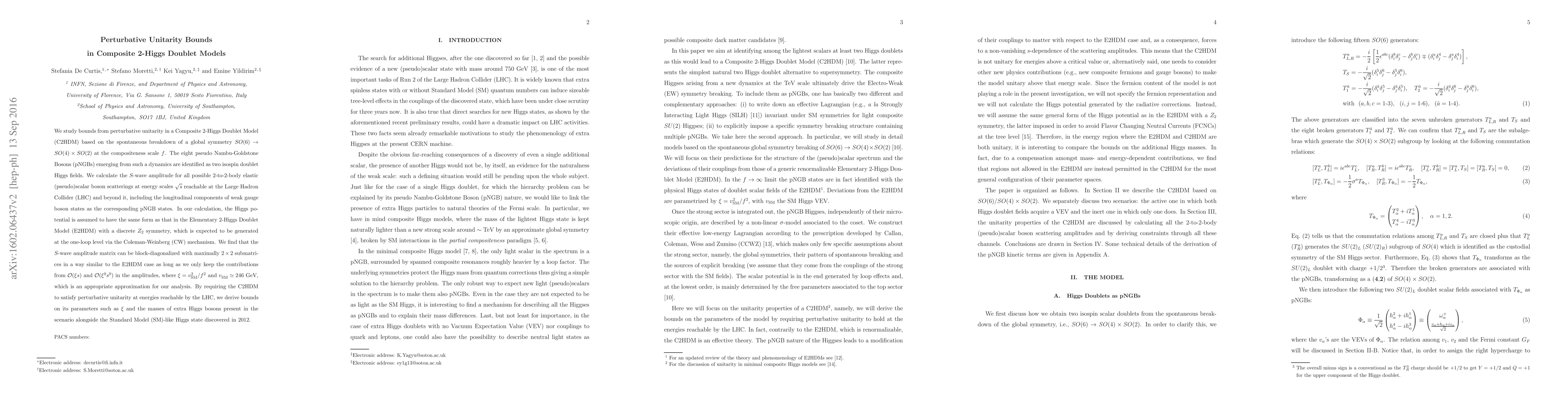 This paper investigates perturbative unitarity bounds in a Composite 2-Higgs Doublet Model (C2HDM) based on $SO(6)\to SO(4)\times SO(2)$ symmetry breaking, identifying eight pseudo Nambu-Goldstone Bosons as two Higgs doublets. It calculates $S$-wave amplitudes for 2-to-2 scatterings at LHC energies, deriving parameter bounds to ensure unitarity.