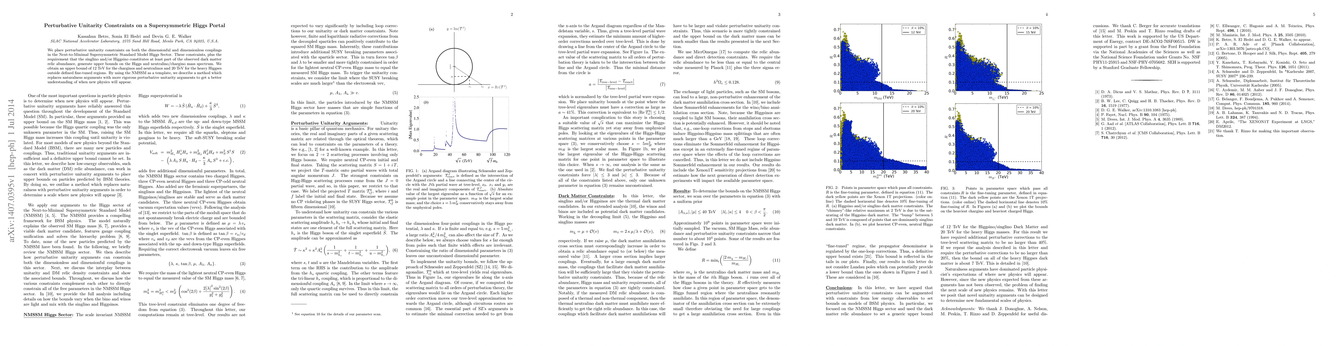 The paper imposes perturbative unitarity constraints on the Higgs portal in the Next-to-Minimal Supersymmetric Standard Model, establishing upper limits for charginos/neutralinos at 12 TeV and heavy Higgses at 20 TeV, while also ensuring the observed dark matter relic abundance. This approach prioritizes perturbative unitarity over naturalness to predict the emergence of new physics.